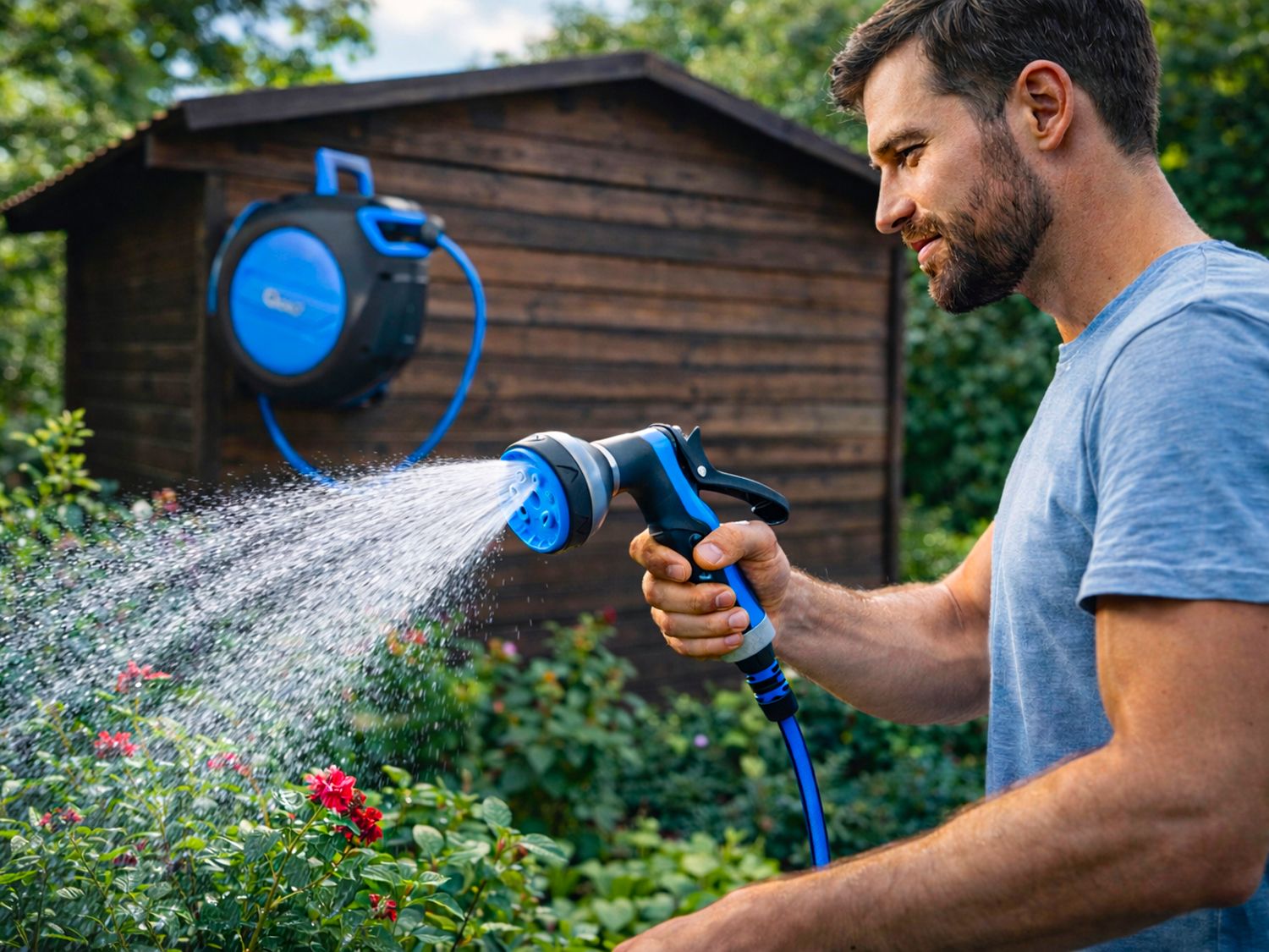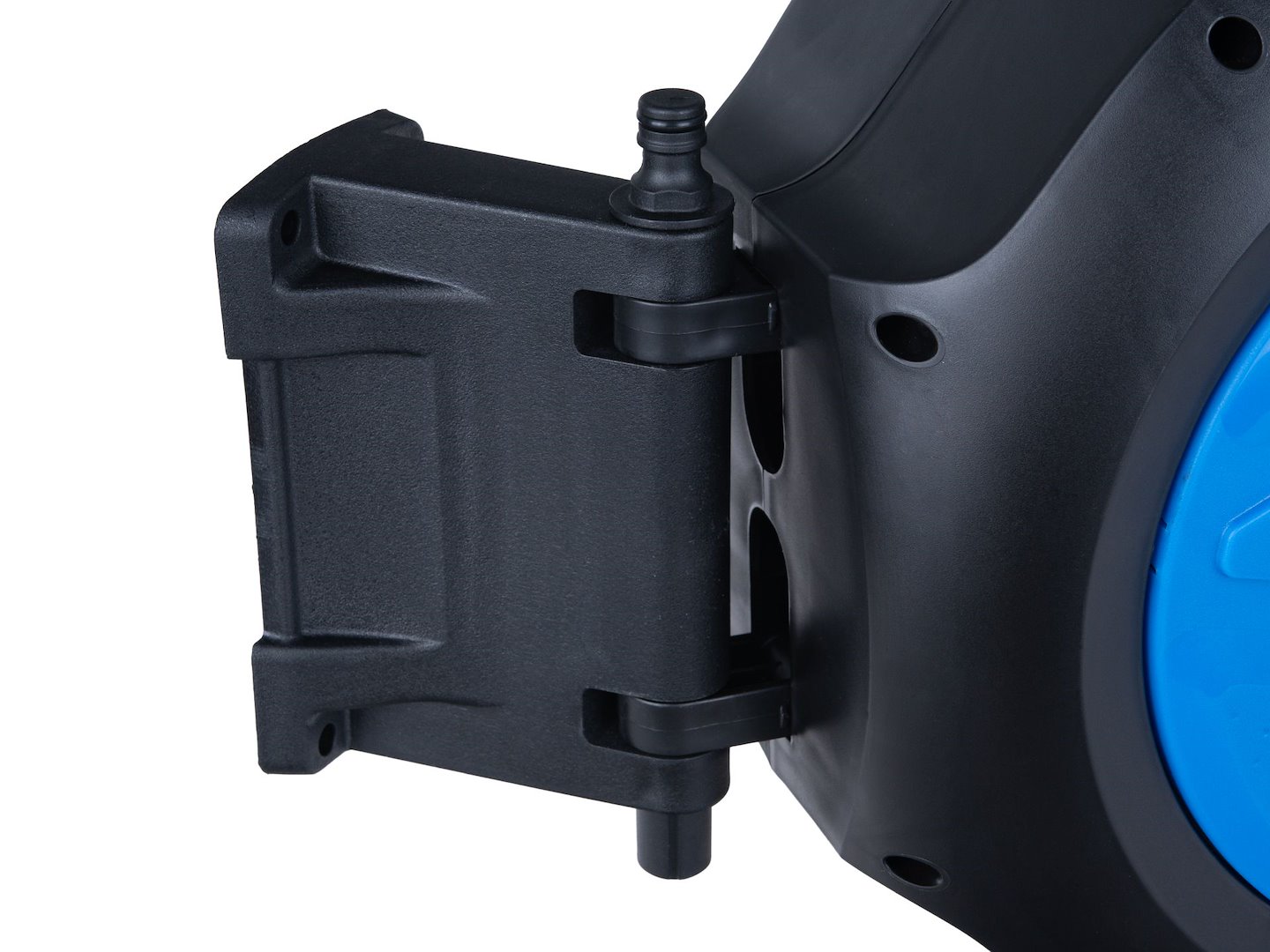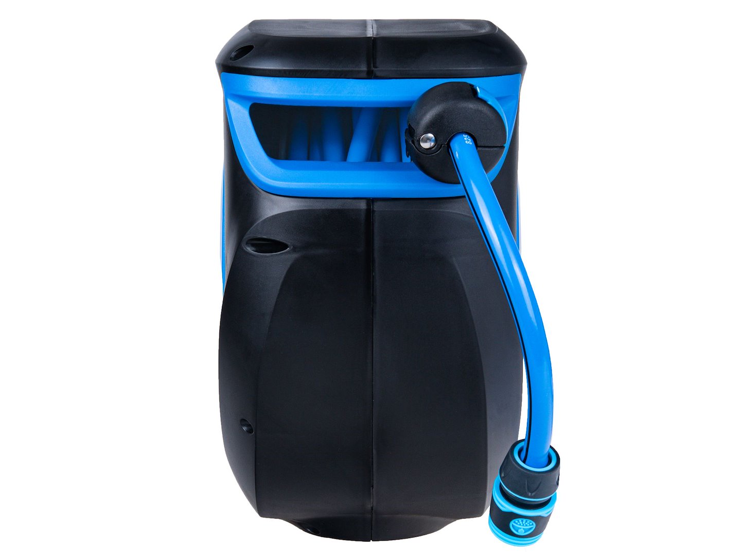 Kompaktno ohišje z dimenzijami 35,5 × 36 × 20 cm ščiti cev pred pregibanjem in UV-sevanjem, priložena kovinska pištola s 7 funkcijami pa omogoča nastavitev pretoka vode za zalivanje, pranje ali splakovanje. To je rešitev za tiste, ki se po vsakem zalivanju ne želijo ukvarjati z zapleteno cevjo ob steno hiše.