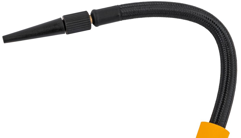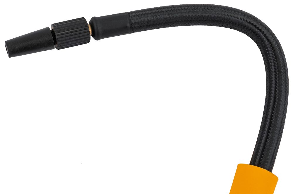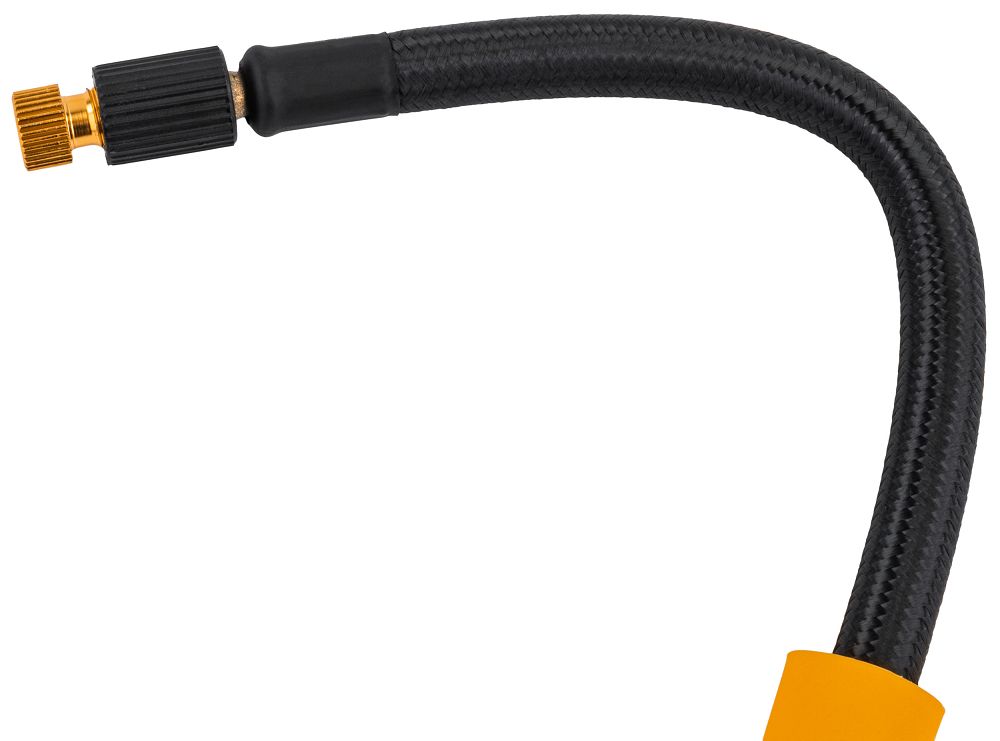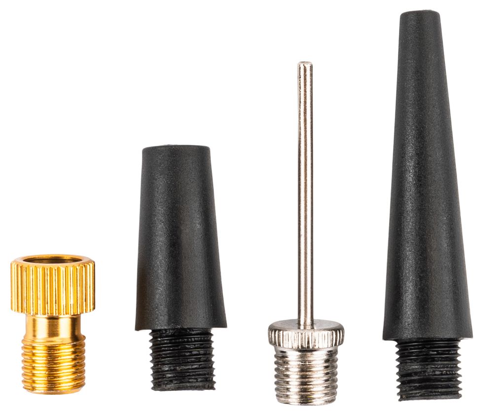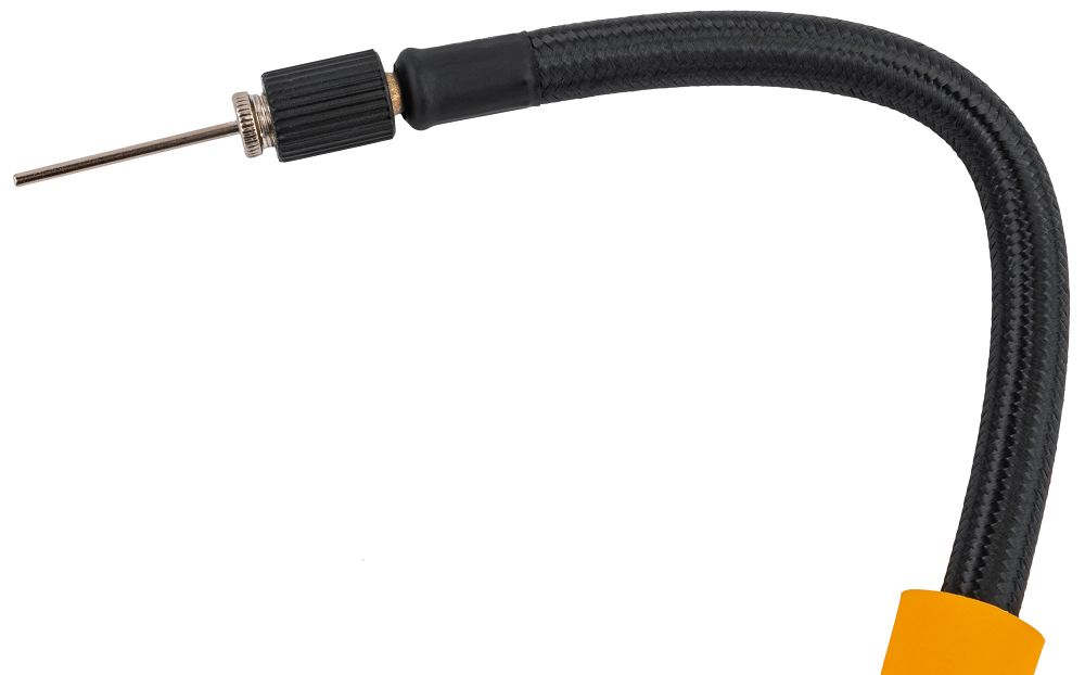 Kompresor je opremljen s kompletom zamenljivih konic, ki omogočajo natančno prilagoditev orodja različnim vrstam ventilov. Črpalka ima integriran Schraderjev ventil, ki se nahaja neposredno na cevi, kar omogoča hitro in varno povezavo s standardnimi avtomobilskimi ventili. Zaradi tega je polnjenje pnevmatik avtomobilov in motornih koles enostavno.