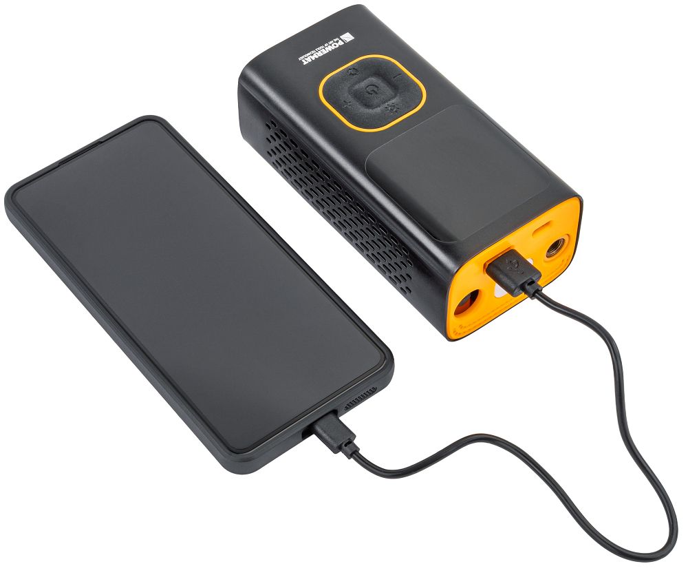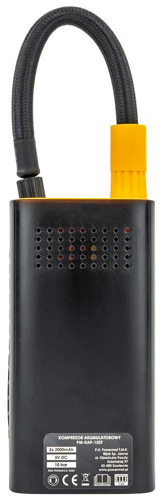 Avtomobilski kompresor, 80 W | PM-KAP-150T je prenosna naprava za hitro polnjenje pnevmatik, žog ali napihljivih predmetov brez potrebe po zunanjem napajanju. Naprava ponuja moč 80 W in največji tlak 10 barov / 150 PSI, kar zagotavlja hitro in učinkovito polnjenje različnih vrst pnevmatik in dodatne opreme. Opremljen je z baterijo s kapaciteto 4000 mAh (2×2000 mAh), ki omogoča mobilno delovanje brez potrebe po stalni priključitvi na električno omrežje.