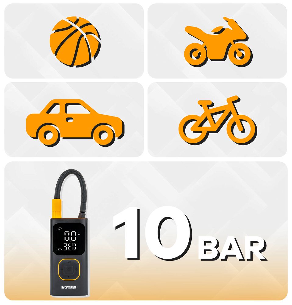Kompresor je primeren za polnjenje pnevmatik na osebnih avtomobilih, SUV-jih, motornih kolesih, kolesih in električnih skuterjih, hkrati pa ponuja parametre, prilagojene različnim vrstam vozil. Odlično deluje tudi s športno in rekreacijsko opremo, saj omogoča hitro napihovanje žog, vzmetnic in napihljivih dodatkov, zaradi česar je univerzalno orodje za domačo in potovalno uporabo.