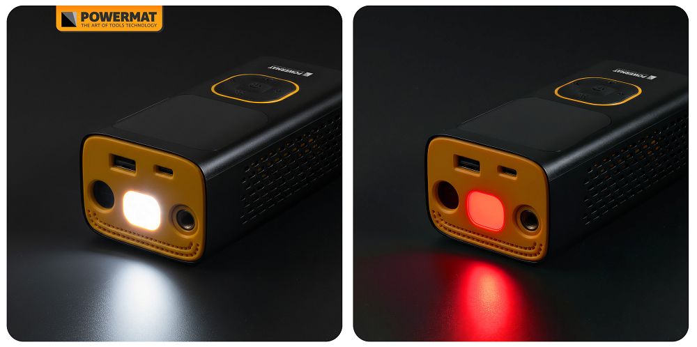 Opremljen je s senzorjem pregrevanja in zaščito pred napačnim tlakom in napačnim polnjenjem, kar ščiti tako napravo kot uporabnika. Prilagoditev delu v ekstremnih temperaturah poveča zanesljivost naprave v delavnici, na cesti in na terenu. Vrata USB omogočajo uporabo naprave kot prenosne baterije. LED-lučka ponuja neprekinjeno osvetlitev, zasilno osvetlitev in načine SOS, kar znatno poveča funkcionalnost kompresorja v slabih svetlobnih pogojih.