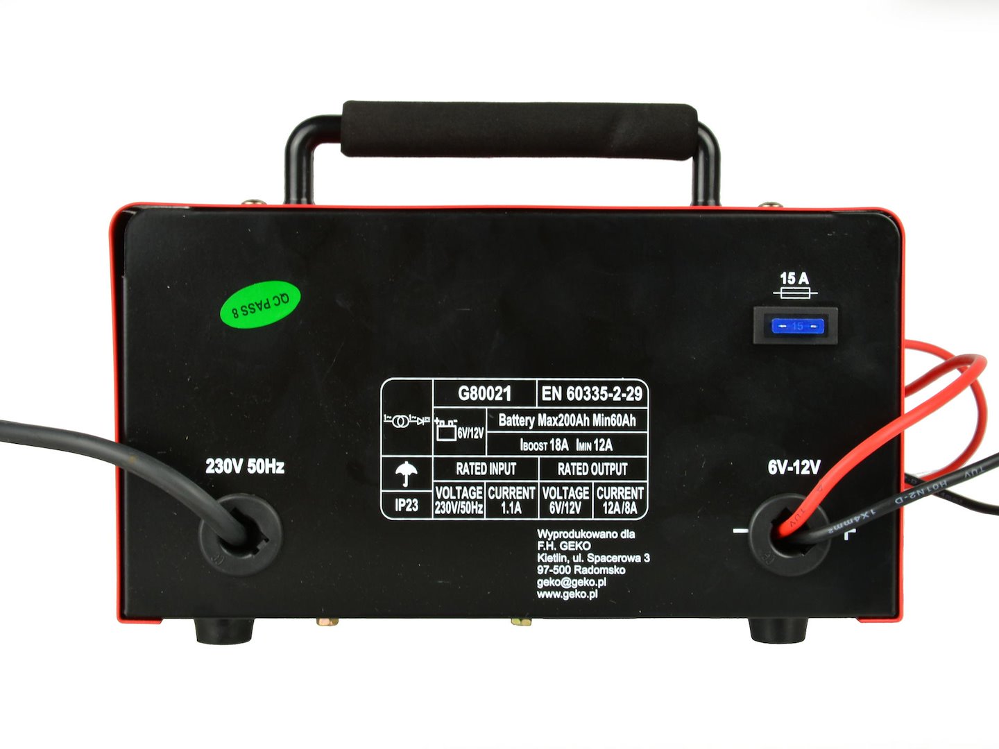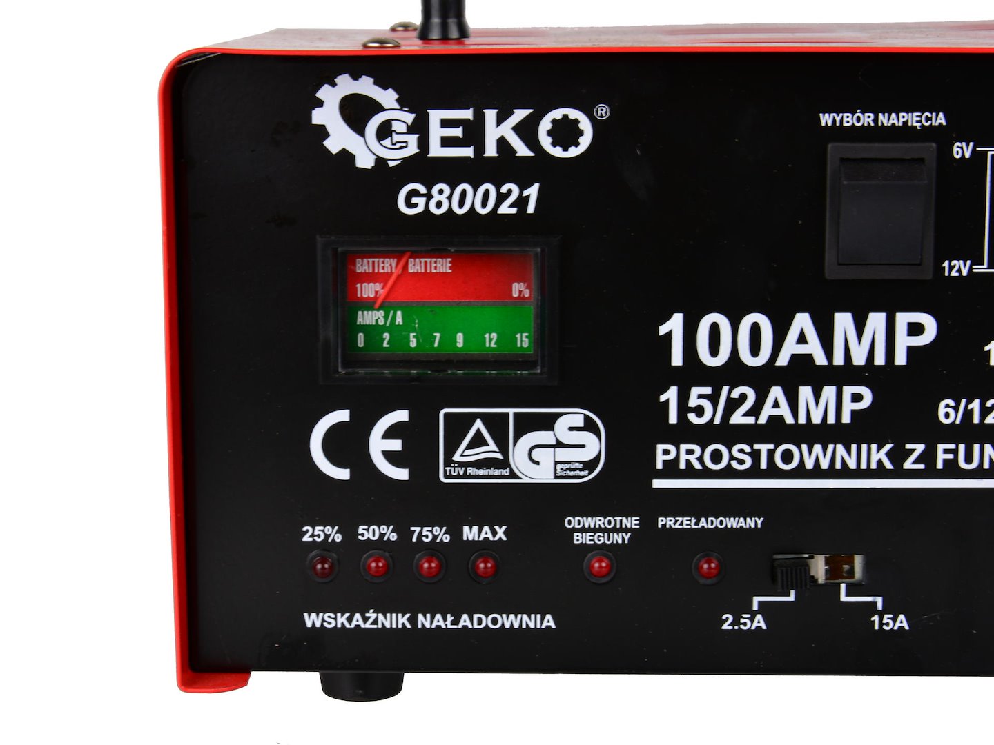 Avtomobilski polnilec z zaganjalnikom, 100A, 6/12V | GEKO se uporablja za polnjenje in hitro oživljanje izpraznjenih akumulatorjev v avtomobilih ali motornih kolesih. Polnilec s funkcijo zagona je zasnovan za zagon in polnjenje svinčeno-kislinskih akumulatorjev z napetostjo 6 V ali 12 V, ki se med drugim uporabljajo v osebnih avtomobilih, motornih kolesih, čolnih itd.