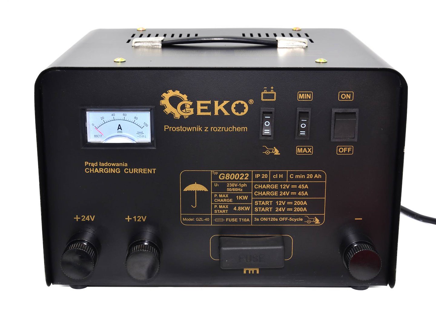Avtomobilski polnilnik z zaganjalnikom, 200A, 12/24V | GEKO omogoča polnjenje in daljinski zagon akumulatorjev v osebnih in tovornih avtomobilih. Zasnovan je za zagon in polnjenje 12 V ali 24 V svinčenih akumulatorjev – akumulatorjev z napetostjo 12 V ali 24 V, ki se med drugim uporabljajo v tovornjakih in gradbenih strojih, pa tudi za zagon motorjev z notranjim zgorevanjem v primeru popolne izpraznitve akumulatorja ali zelo nizkih temperatur okolice.