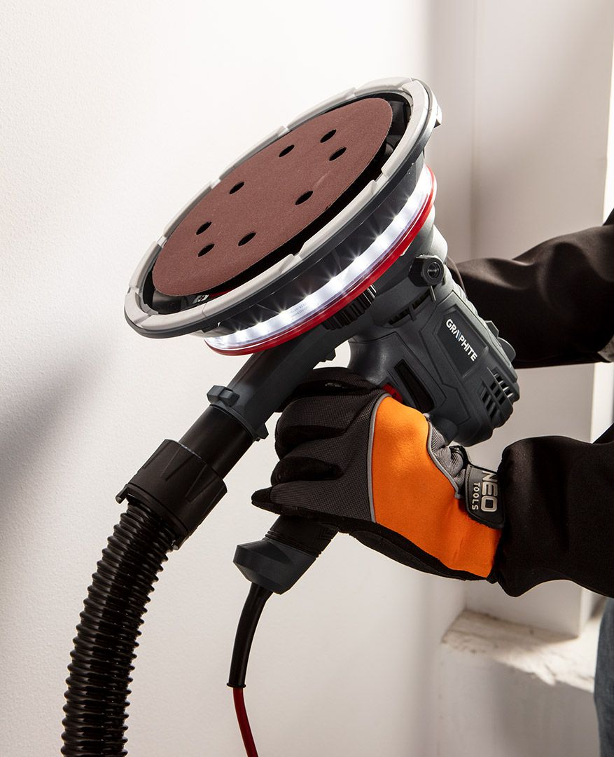 Brusilnik za omet, 900 W, 180 mm | GRAPHITE je visokokakovostna naprava za obdelavo ometnih površin s praktično LED osvetlitvijo. LED osvetlitev vam omogoča še natančnejše opravljanje nalog. Brusilnik ima moč 900 W in brezstopenjsko nastavljivo rotacijsko glavo s hitrostjo od 1400 do 2700 vrt/min. Brusilni disk ima premer 180 mm.