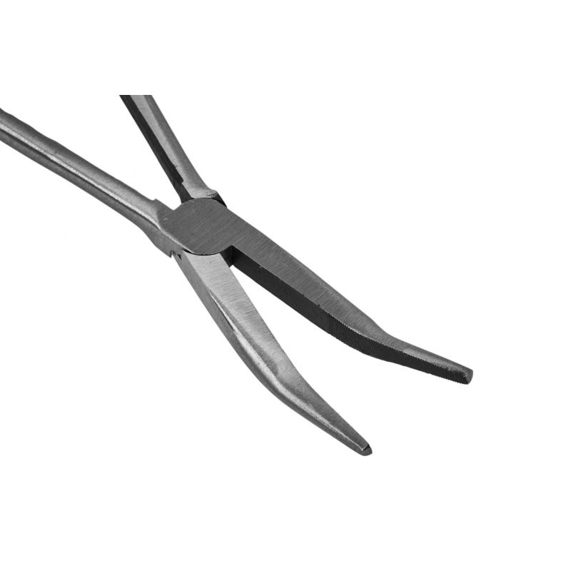 Cleștele curbat lung, 20° | KD10815 este o unealtă manuală utilă pentru manipularea și ținerea materialelor în diverse ateliere și lucrări de reparații. Acesta facilitează prinderea, fixarea, îndoirea sau manipularea firelor, șuruburilor și a altor materiale care se află în spații greu accesibile sau înguste.