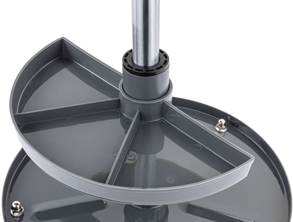 Sedež s premerom 30 cm zagotavlja varno oporo in udoben položaj, kar boste cenili med daljšimi montažnimi in popravilnimi deli. Stol ima dva držala za orodje, ki omogočata priročno shranjevanje najpogosteje uporabljenega orodja in pripomočkov. Ta rešitev skrajša čas iskanja orodja, izboljša organizacijo dela in vam omogoča vzdrževanje reda, ne da bi morali nenehno vstajati.
