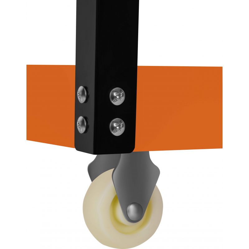 Stabilna jeklena konstrukcija zagotavlja vzdržljivost in nosilnost, štiri transportna kolesa pa omogočajo gladko premikanje vozička po različnih površinah. Druga prednost je ergonomski transportni ročaj in stranska tirnica z luknjami, ki omogoča obešanje orodja. Kompaktna zasnova in premišljena razporeditev elementov omogočata udobno uporabo vozička in vzdrževanje reda na delovnem mestu.