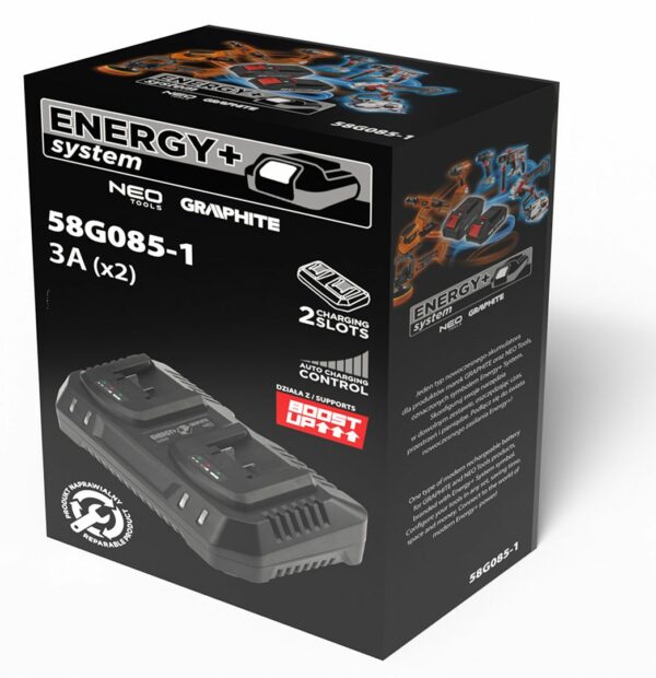 Dvojni polnilnik za baterije Energy+, 21V | GRAPHITE je naprava, ki omogoča hkratno polnjenje dveh baterij Energy+ brez izgube njihove kapacitete. Polnilnik podpira največji tok 3000 mA in se uporablja za polnjenje litij-ionskih baterij z napetostjo 18 V. Zagotavlja polnilno napetost 21 V in se napaja iz omrežne napetosti 230 V~50 Hz. Baterije se popolnoma napolnijo v 45 do 135 minutah, odvisno od njihove kapacitete. Postopek polnjenja prikazuje praktična LED lučka, ki prikazuje naslednja stanja: