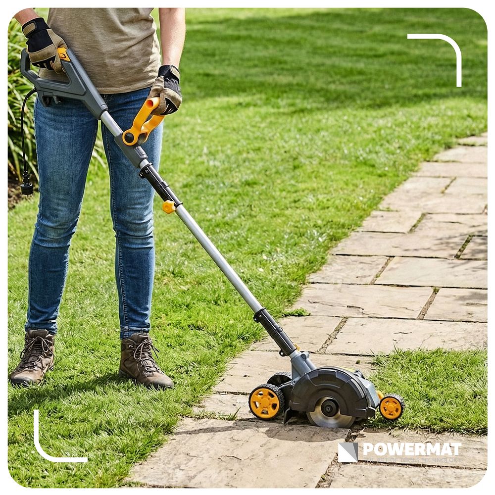 Električna kosilnica za trato, 1500 W | PM-EKT-1500T vam omogoča natančno odstranjevanje plevela, mahu in trave iz vrzeli tlakovcev in robov trate. Zahvaljujoč moči 1500 W in delovni širini 200 mm delate hitreje in natančneje, pri čemer dosežete ravne robove in estetsko obdelavo površine brez uporabe kemikalij.