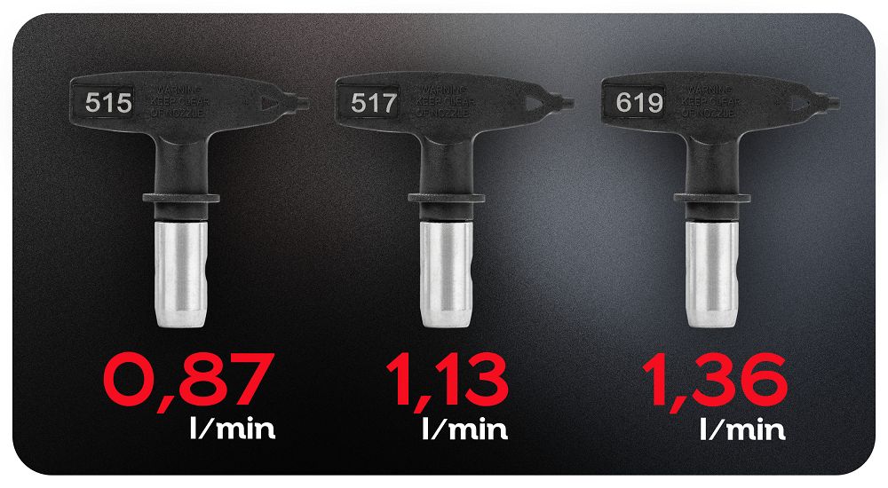 Cev dolžine 10 m in teža 7 kg omogočata prosto gibanje brez pogostega premikanja naprave, tako da lahko učinkovito barvate stene, strope in fasade v večjih stavbah. Po delu z barvami na vodni osnovi je dovolj voda, pri materialih na oljni osnovi pa mineralno topilo, ki pospeši pripravo na naslednjo uporabo. Komplet vsebuje brizgalno pištolo, šobe 515/517/619 in manometer, ki prikazuje trenutni delovni tlak, zato ga morate le priključiti, nastaviti tlak in začeti delati.