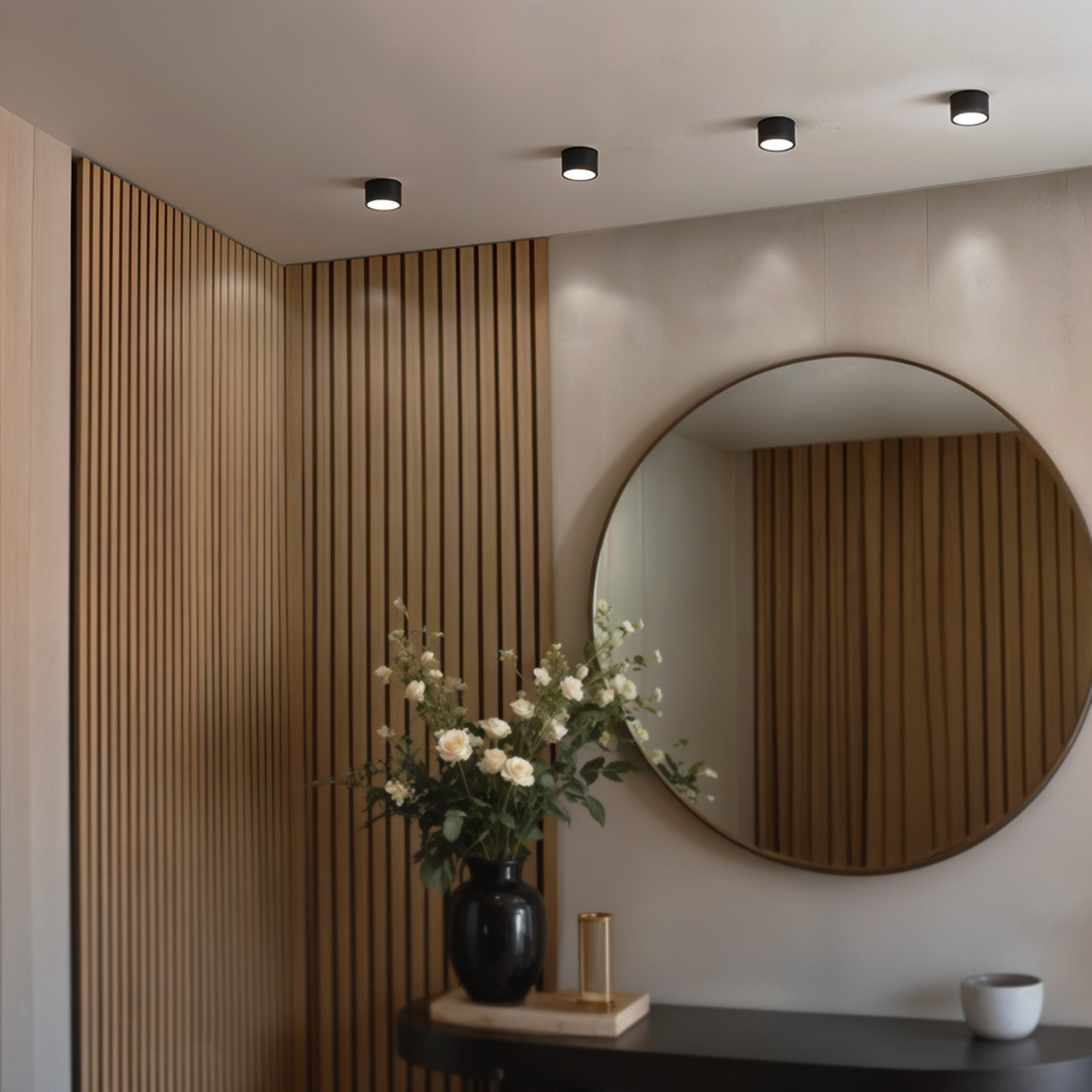 Halogenska LED stropna svetilka GX53, črna | 82 mm je univerzalna svetilka z minimalističnim videzom, ki bo estetsko dopolnila vsako notranjost. Ta svetilka navdušuje s svojo minimalistično zasnovo – valjaste oblike v črnem odtenku, ki je primerna za moderno stanovanje, pisarno ali jedilnico.