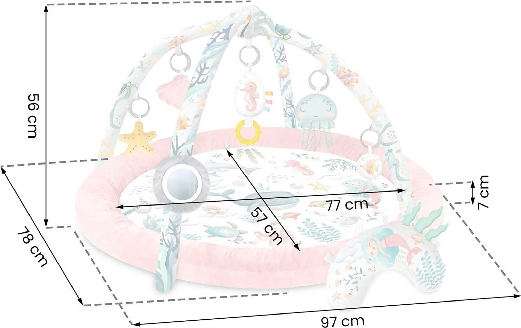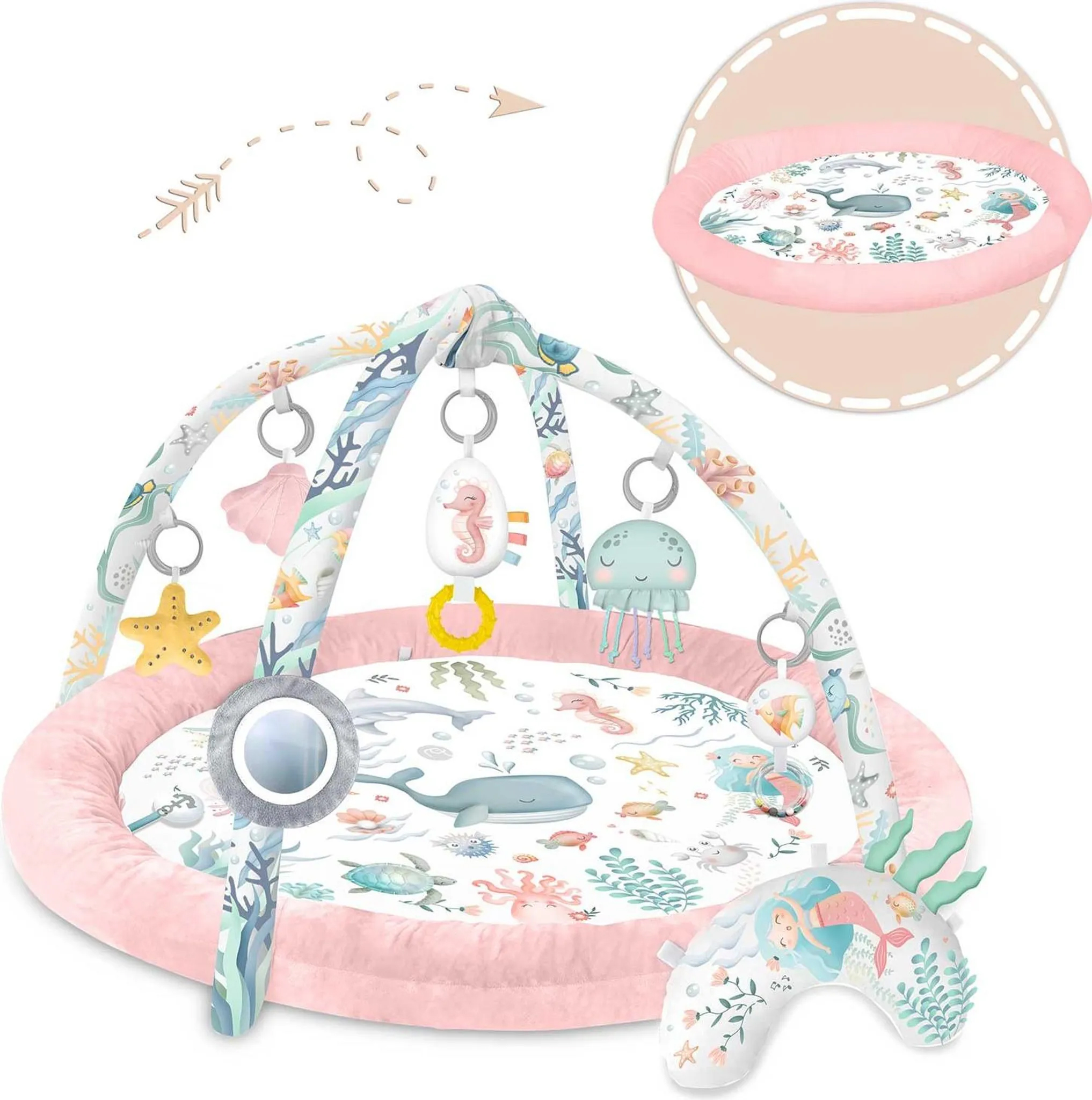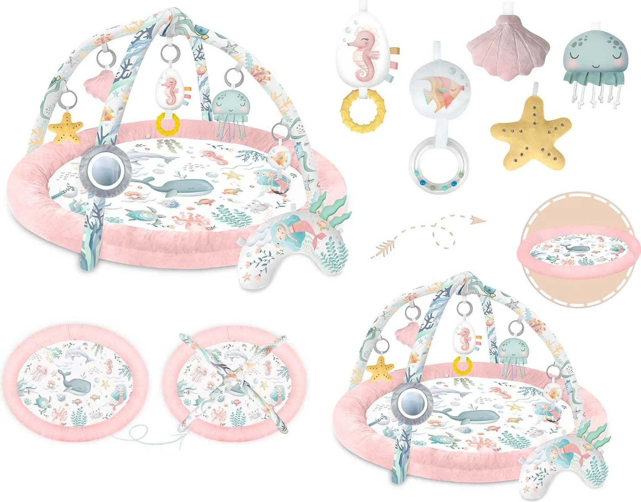 Priložena je tudi blazina, ki pomaga krepiti mišice vratu in hrbta. Podloga je izdelana iz mehkih, hipoalergenih materialov, ki so prijetni na dotik, enostavni za čiščenje in izpolnjujejo stroge evropske varnostne standarde EN 71. Zaradi lahke konstrukcije jo je enostavno zložiti in prenašati, privlačen dizajn z oceansko tematiko pa jo naredi idealen prostor za igro in sprostitev – popolna izbira za vsakega dojenčka in praktičen pomočnik za starše.