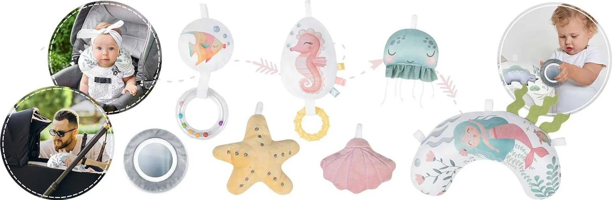 Služi kot udobno otroško gnezdo ali razgrnjena igralna odejica z dvema lokoma in sedmimi različnimi igračami – ropotuljicami, šumečimi elementi, mehkimi figuricami in varnim ogledalom, ki spodbujajo otrokov vid, sluh in dotik ter razvijajo njegove motorične sposobnosti.