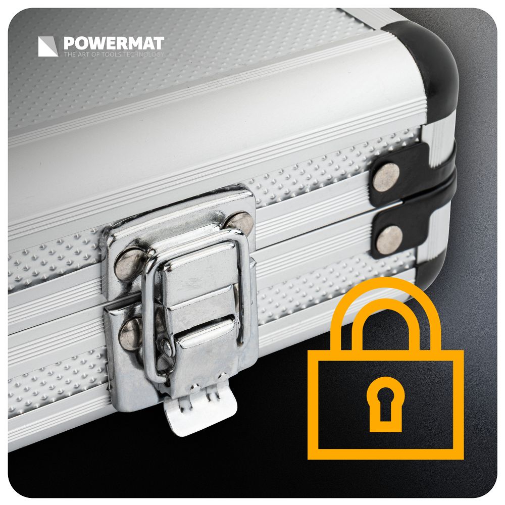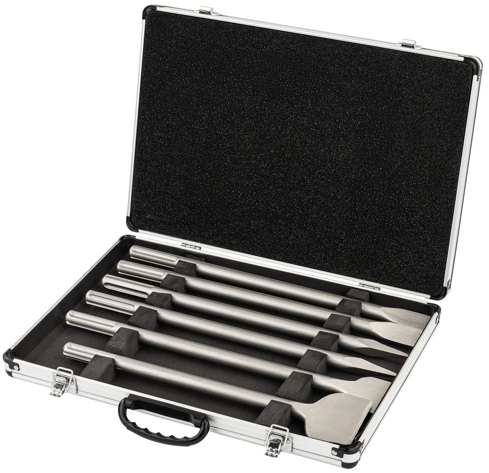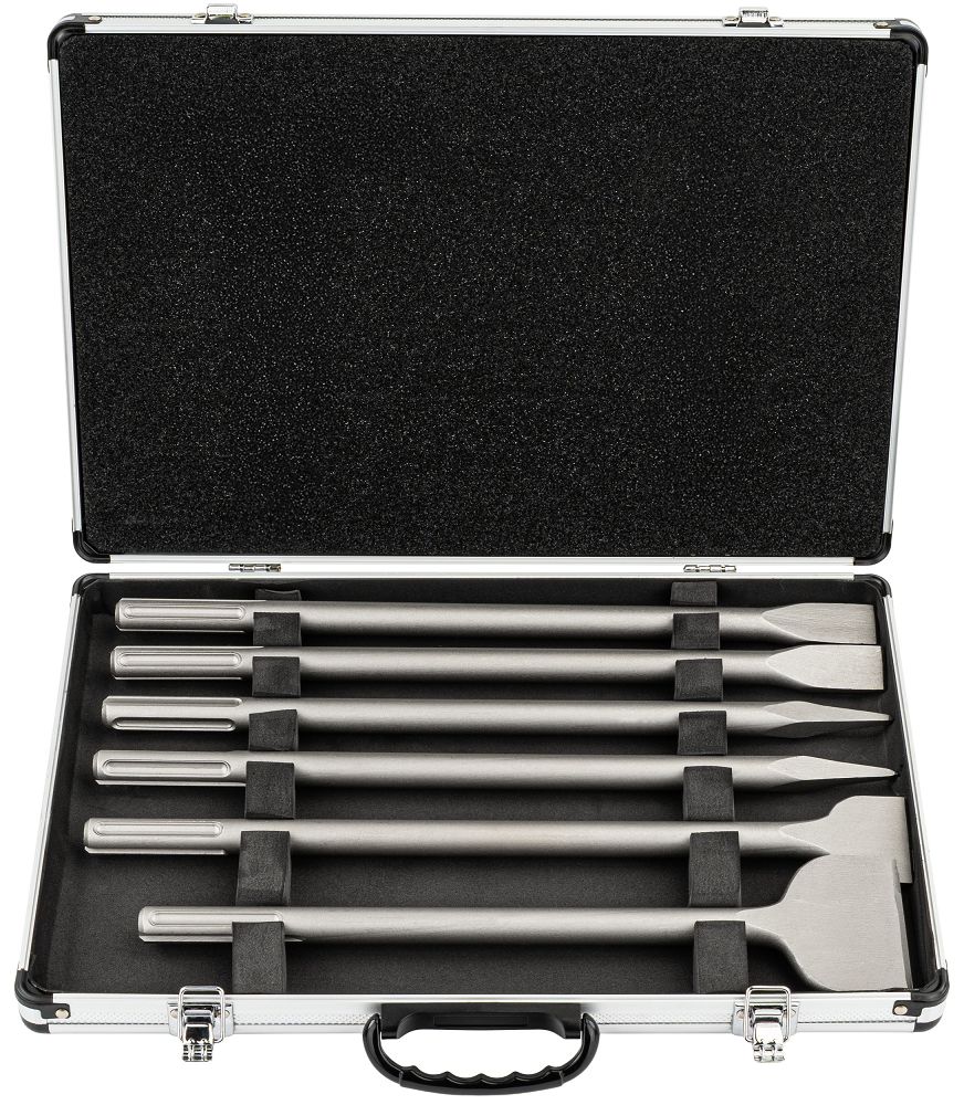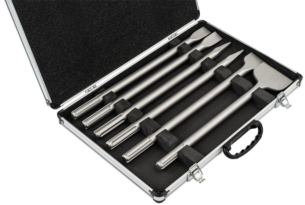 Komplet vključuje ravna in koničasta dleta za beton, opeko in kamen širine 25, 50 in 80 mm, ki omogočajo natančno rezanje in hitro odstranjevanje materiala s čistejšimi robovi in manjšo potrebo po popravkih. Celoten komplet je mogoče shraniti v praktičnem kovčku, kjer ima vsak kos svoje mesto, kar olajša organizacijo, zagotavlja varno shranjevanje in priročen transport; ključavnica ščiti vsebino pred odpiranjem ali razlitjem in zagotavlja, da bo komplet ostal varno zaprt.