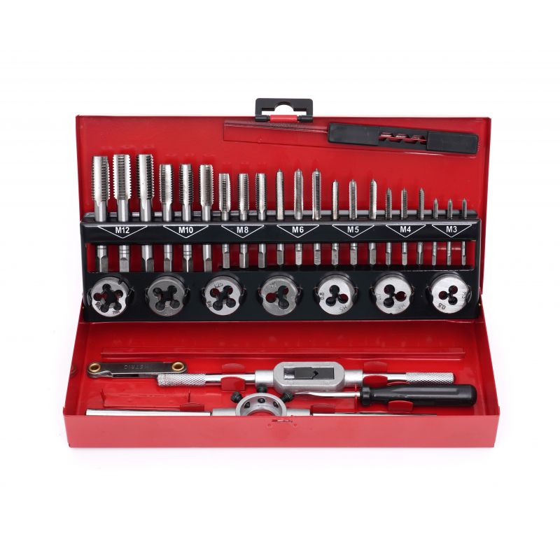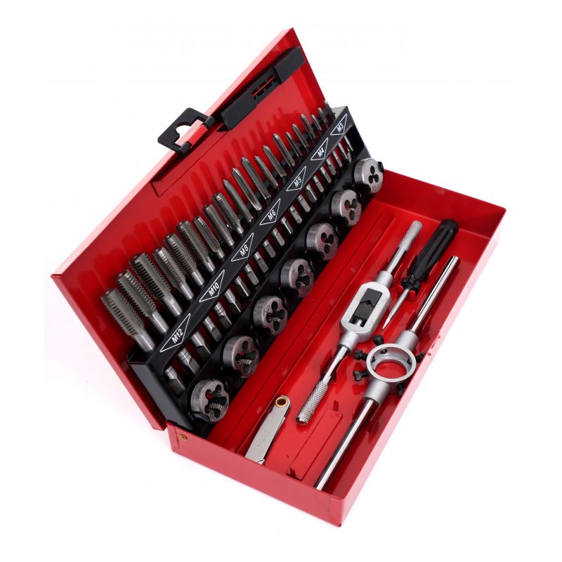 Komplet navojnih svedrov in matic, 32 kosov | KD10090 vsebuje enostavno orodje, ki je nepogrešljivo v vsaki delavnici, domači garaži ali delovnem mestu. Komplet se uporablja za popravilo navojnih spojev vseh vrst v večini materialov. Izdelani so iz najkakovostnejšega kaljenega jekla. Navojni svedri se uporabljajo za rezanje notranjih navojev.