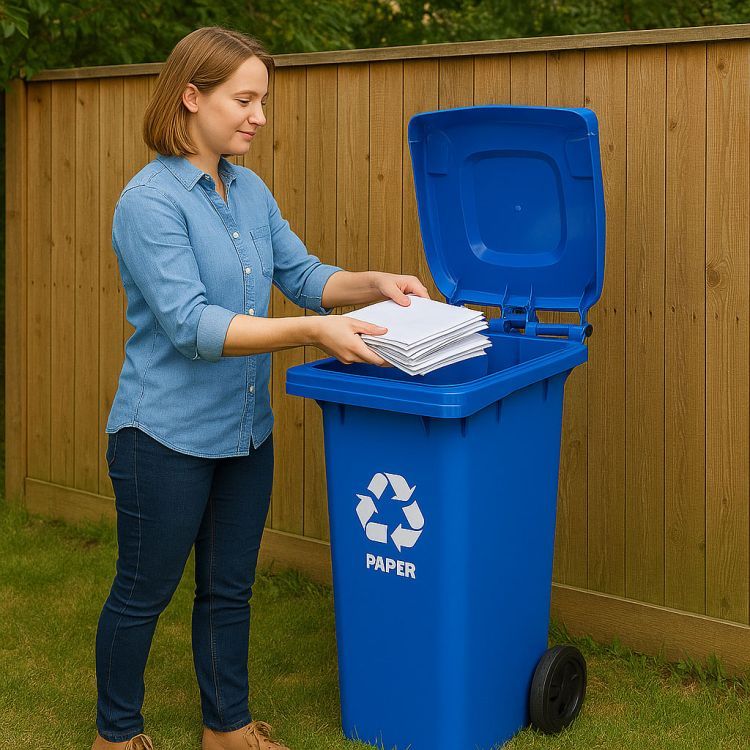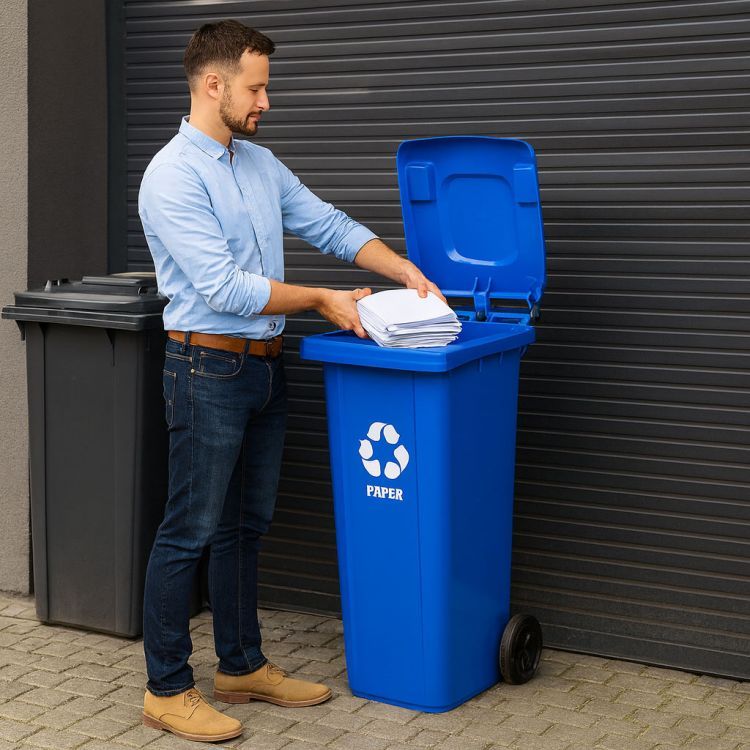 Koš za papirne odpadke, 120L | moder na kolesih je praktična in mobilna rešitev za zbiranje in premikanje odpadkov doma ali na prostem. Izdelan je iz trpežne HDPE plastike, odporen je na UV-sevanje, kemikalije in mehanske poškodbe, zaradi česar je primeren za vse vremenske razmere. Tesno prilegajoč se pokrov ščiti pred vodo in neprijetnimi vonjavami, kar zagotavlja higiensko uporabo.