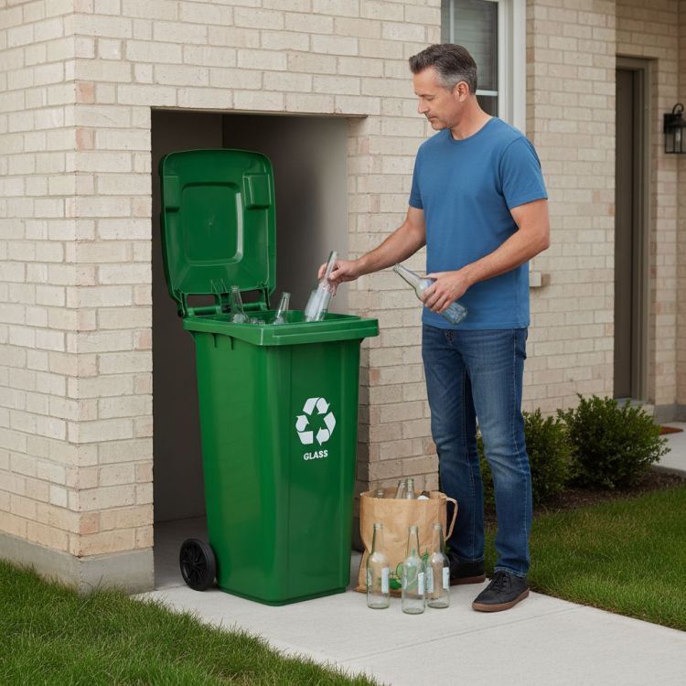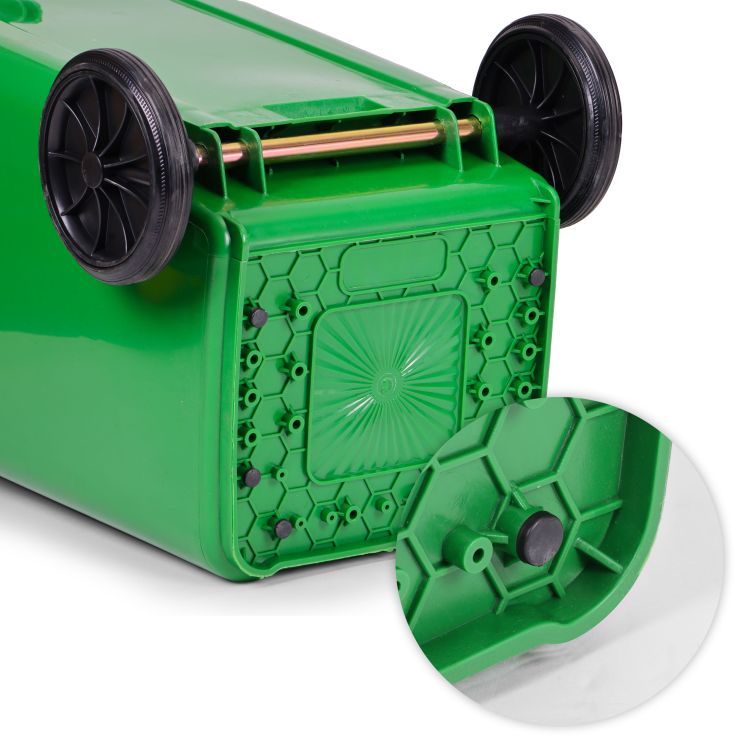 Koš za steklene odpadke, 120L | zelen na kolesih je praktična in mobilna rešitev za zbiranje in premikanje odpadkov doma ali na prostem. Izdelan je iz trpežne HDPE plastike, odporen je na UV-sevanje, kemikalije in mehanske poškodbe, zaradi česar je primeren za vse vremenske razmere. Tesno prilegajoč se pokrov ščiti pred vodo in neprijetnimi vonjavami, kar zagotavlja higiensko uporabo.