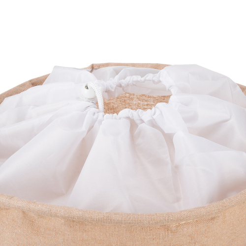 Košara za igrače, 35L, bež | Kruzzel, bo služila kot praktična košara za shranjevanje otroških igrač ali drugih gospodinjskih predmetov. Izdelana je iz trpežnih materialov z vodoodporno notranjo plastjo, ki ščiti vsebino pred vlago. Košaro je mogoče zapreti z vrvico, da se predmeti v njej ne razlijejo, in jo lahko preprosto zložite, ko je ne uporabljate.
