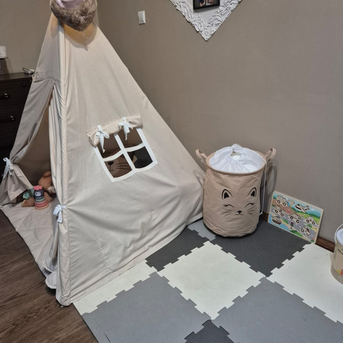Dva praktična ročaja omogočata enostaven transport košare, ne glede na njeno vsebino. Nevtralne barve in diskreten vzorec omogočajo, da se prilega različnim slogom prostorov – pa naj gre za otroško sobo, dnevno sobo ali spalnico –, hkrati pa še vedno izpolnjuje svojo praktično funkcijo.
