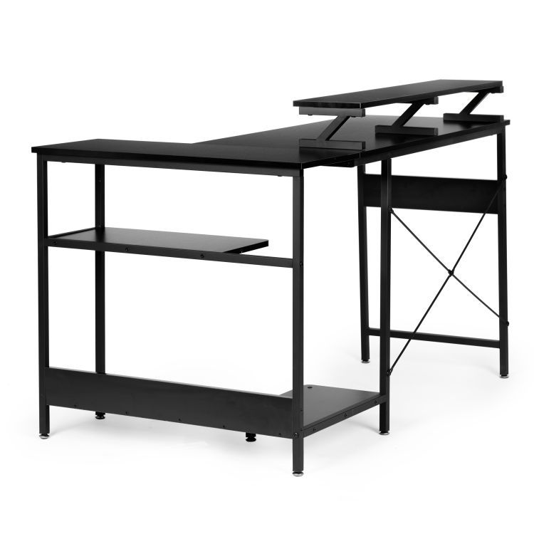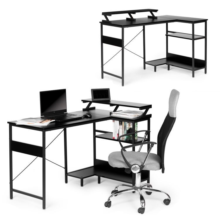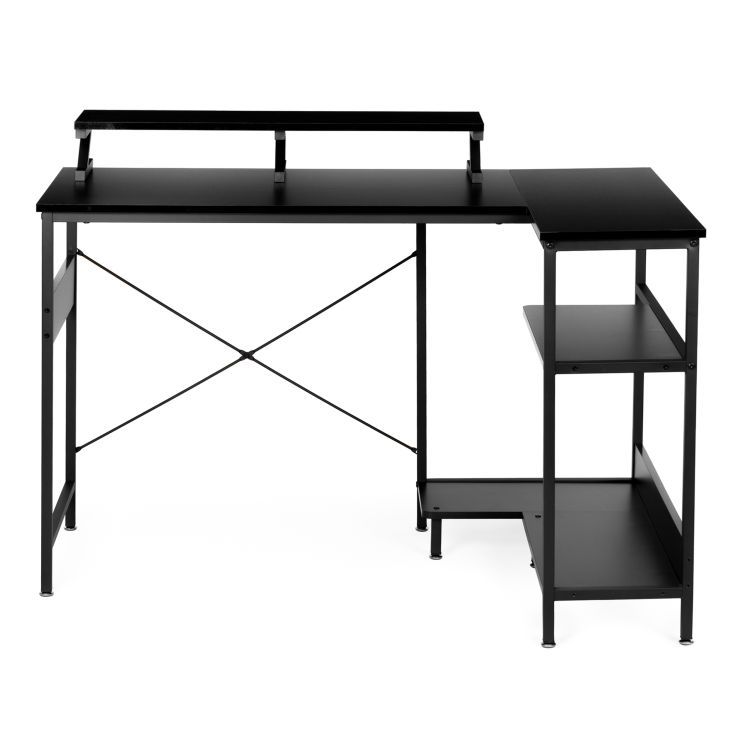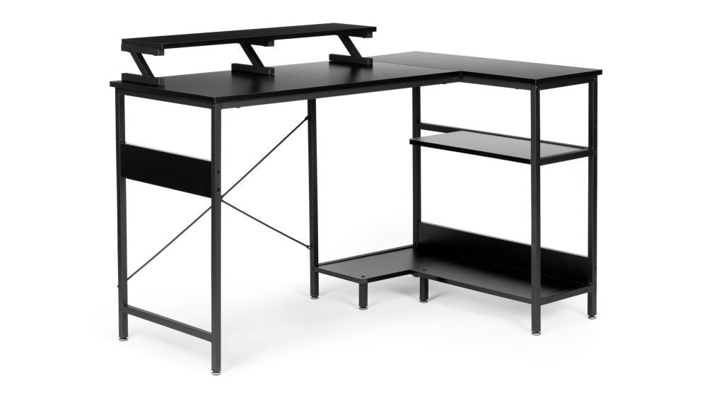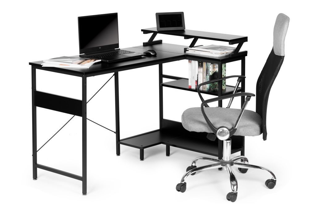 Kotna računalniška miza, 3 police, črna | ModernHome