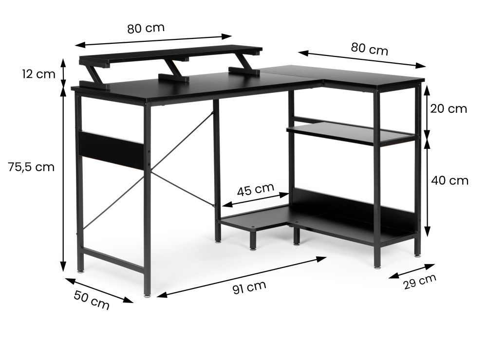 Kotna računalniška miza, 3 police, črna | ModernHome ponuja moderno in funkcionalno rešitev za vašo domačo pisarno ali študijski prostor. Njena velika površina zagotavlja veliko prostora za delo, učenje ali igro, trpežna konstrukcija iz MDF in kovine pa zagotavlja zanesljivost in vzdržljivost. Miza je opremljena z dvema policama in še eno funkcionalno polico na vrhu, ki omogoča enostavno shranjevanje vseh potrebnih stvari. Zahvaljujoč nastavljivim nogam je mogoče mizo popolnoma poravnati, noge pa ščitijo tla tudi pred praskami.