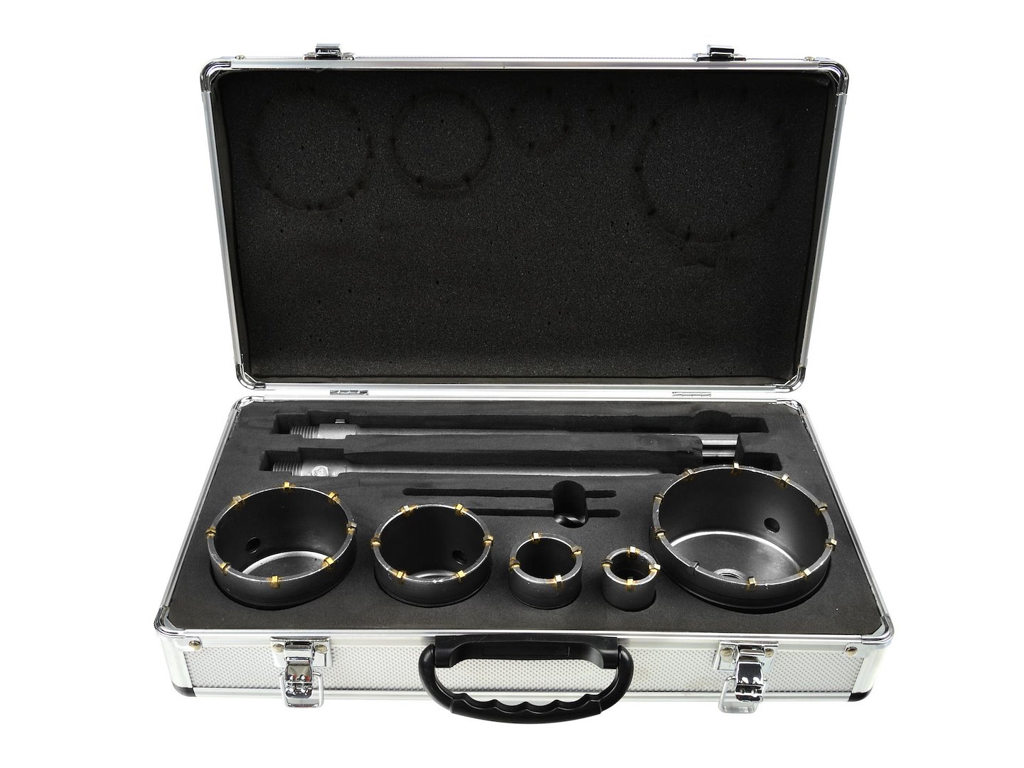 Zahvaljujoč temu lahko ta komplet uporabljate za široko paleto materialov – od opeke, betona, preko plastičnih sten do mavčnih plošč ali betonskih plošč – idealno za rezanje lukenj za električne omarice, vtičnice ali instalacijske vode. Paket vključuje praktičen kovinski kovček, ki ščiti posamezne dele med transportom in skladiščenjem ter zagotavlja, da orodje ostane organizirano in pri roki. Skupna teža kompleta je približno 4700 kg.