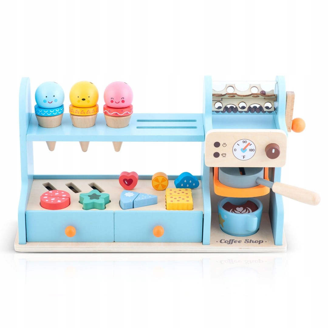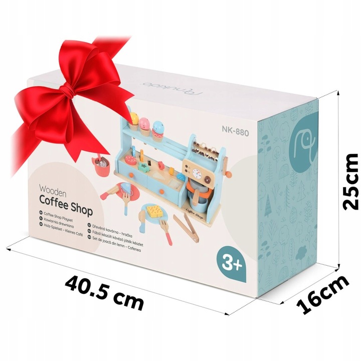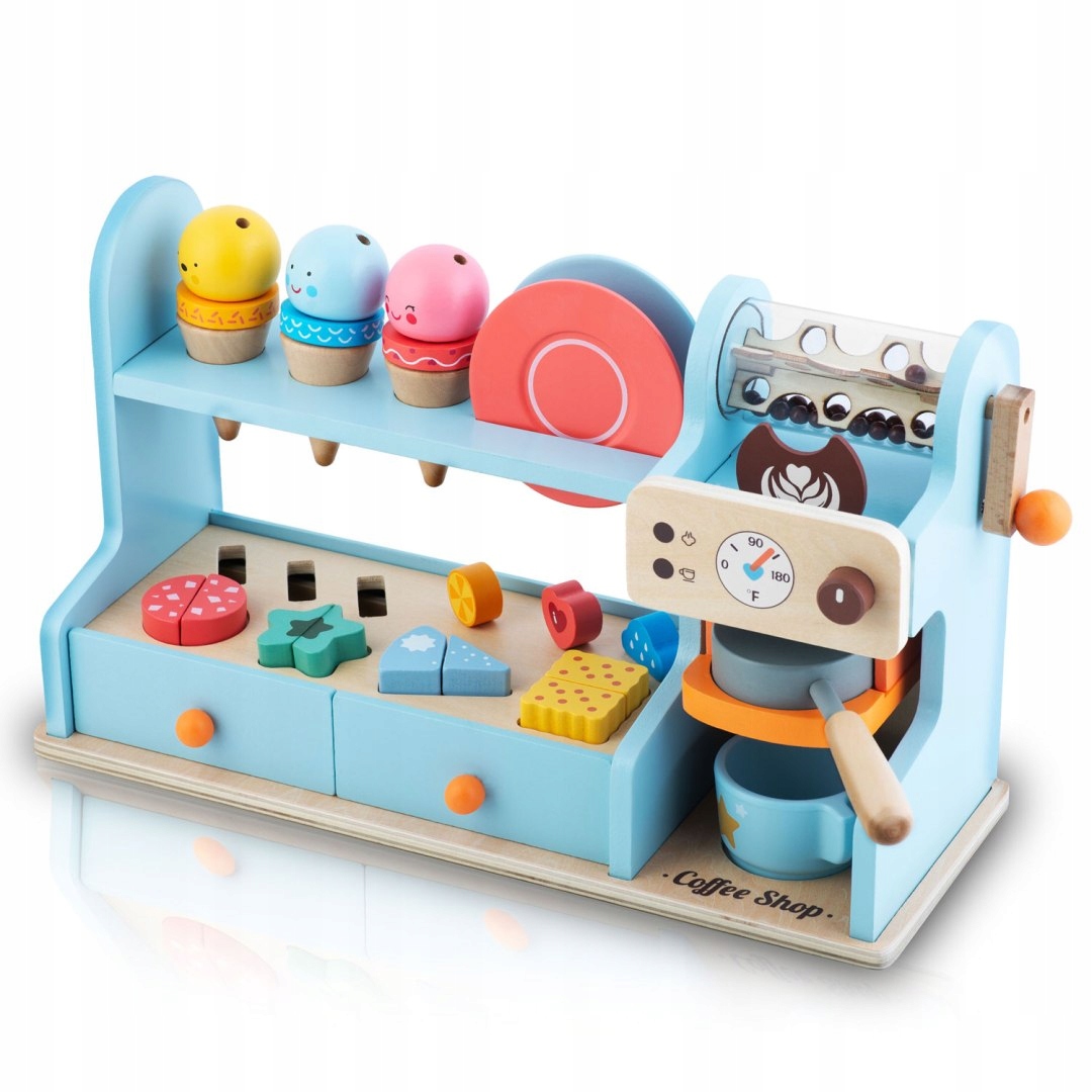 Lesena kavarna za otroke NK-880 | Nukido je interaktivna igrača z realističnimi elementi, ki podpira ustvarjalno igro in razvoj socialnih veščin. Igrača otrokom omogoča, da se igrajo kot natakarji v kavarni ali sladoledarni in tako razvijajo svojo domišljijo med igranjem vlog. Zahvaljujoč leseni zasnovi in skrbni obdelavi se igrača zdi trdna, stabilna in hkrati varna za otroške roke.