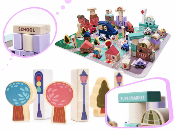 Drevesne izobraževalne kocke s podlogo za sestavljanko – Mesto | 135 kosov