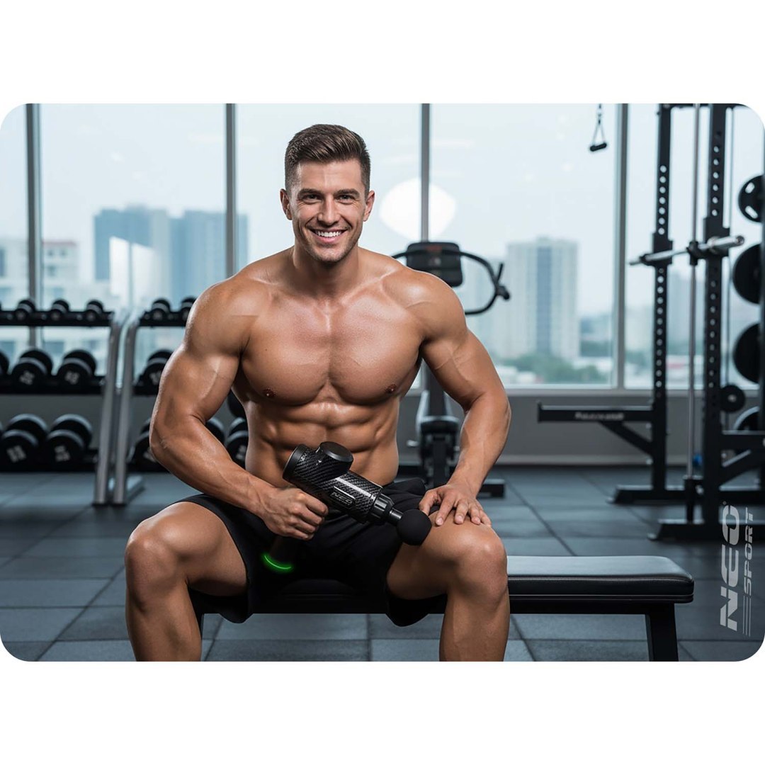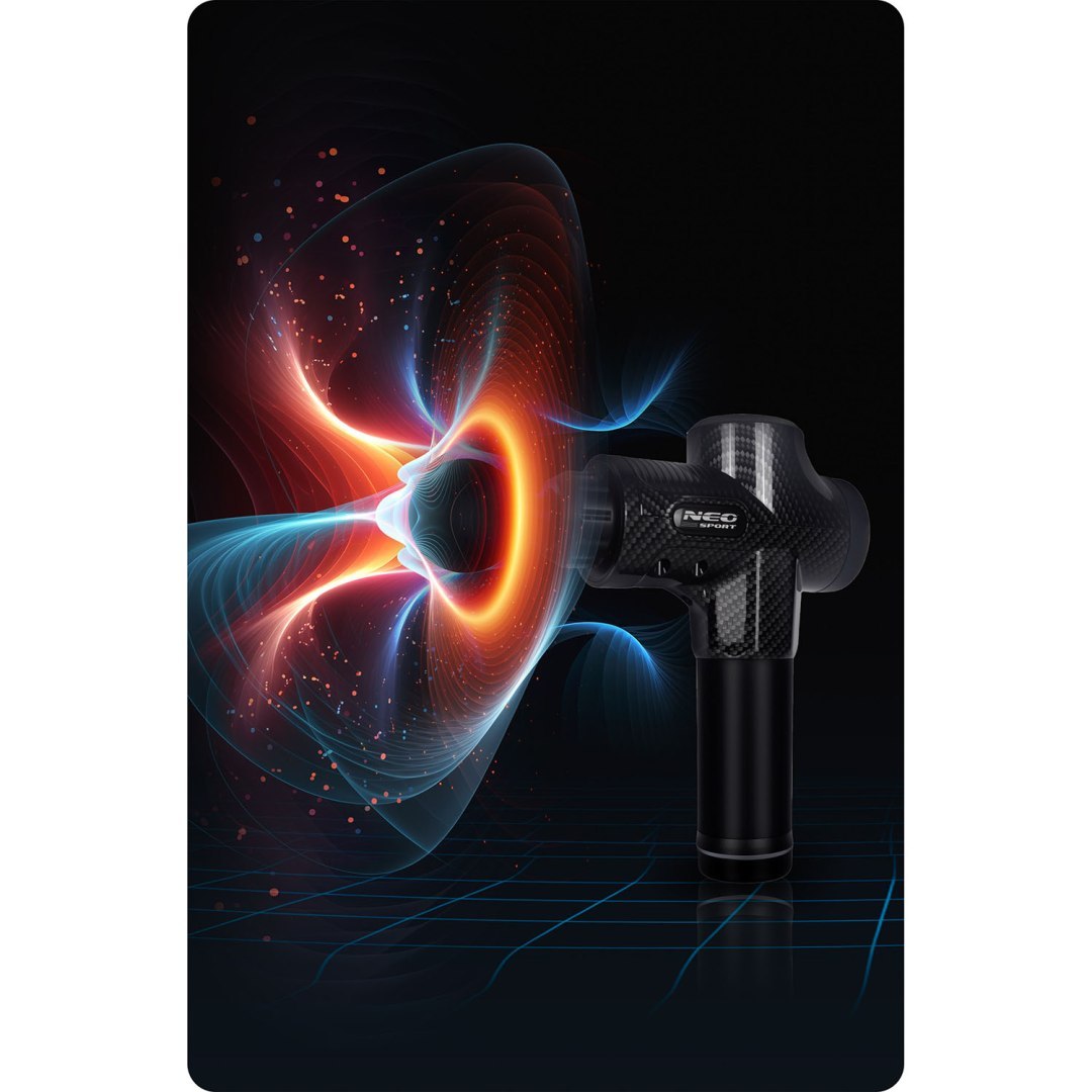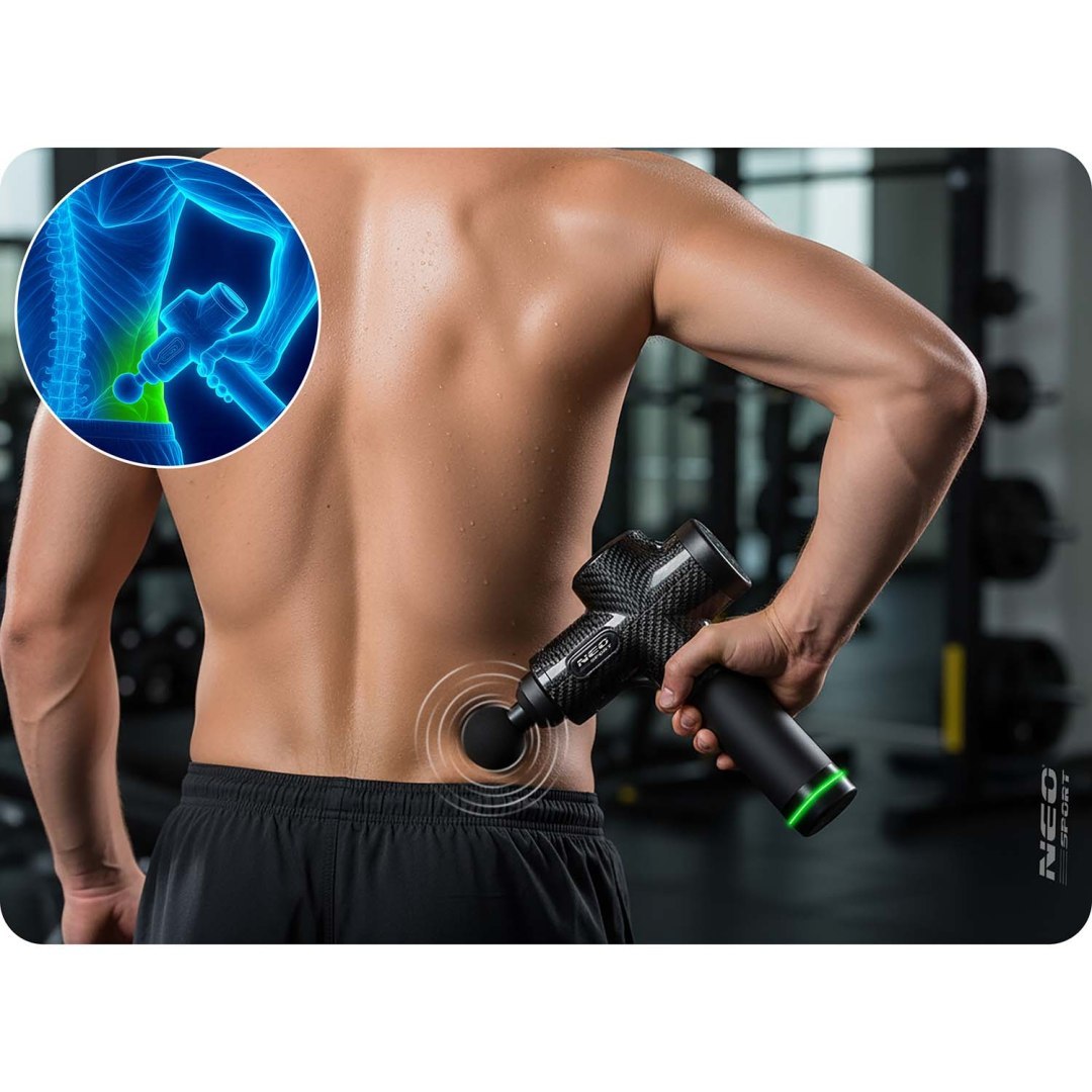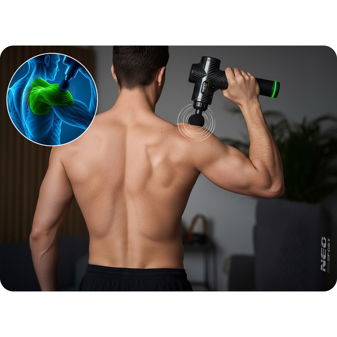 Masažna pištola z 9 nastavki NS-503, črna | Neo-sport je močno masažno orodje, zasnovano za lajšanje mišične napetosti in regeneracijo celotnega telesa. Zahvaljujoč 9 zamenljivim nastavkom lahko masirate različne mišične skupine z natančnim fokusom. Od večjih predelov, kot so hrbet ali stegna, do manjših predelov, kot so ramena ali stopala.