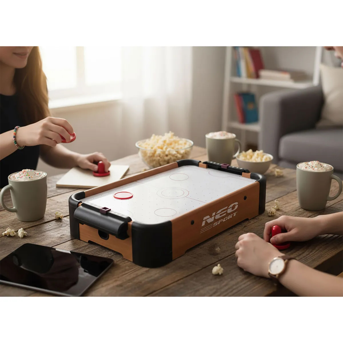 Miza za zračni hokej NS-440 | Neo-Sport prinaša zabavo, medsebojno tekmovanje in skupne trenutke med igranjem ne le otrokom, temveč tudi odraslim. Ta prenosna kompaktna miza za zračni hokej je zasnovana posebej za otroke in družinske trenutke – ima stabilno konstrukcijo in varne konce, kar omogoča varno in zabavno igro tudi mlajšim igralcem.
