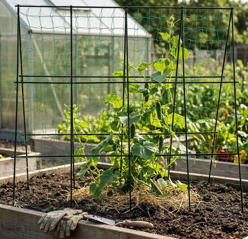 Mreža za kumare s strukturo, 1,2×1,2m | Strend Pro je praktična opora za gojenje kumar in drugih vzpenjavk. Zagotavlja boljše prezračevanje rasti, lažje obiranje in čistejše plodove brez stika s tlemi. Trden okvir v kombinaciji z mrežo omogoča rastlinam, da rastejo navpično, kar prihrani prostor, izboljša dostop do plodov in spodbuja zdravo rast.