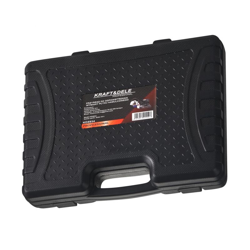 Naprava za odzračevanje | KD5934 omogoča hitro in priročno odzračevanje zavornih sistemov ter zamenjavo zavorne ali sklopkine tekočine. Je nepogrešljivo orodje v vsaki delavnici in garaži. Zahvaljujoč uporabi ročne vakuumske črpalke lahko postopek odzračevanja izvede ena oseba. Prozorna cev omogoča preverjanje pretoka tekočine in prisotnosti zraka, rezervoar za uporabljeno tekočino pa preprečuje njeno razlitje.