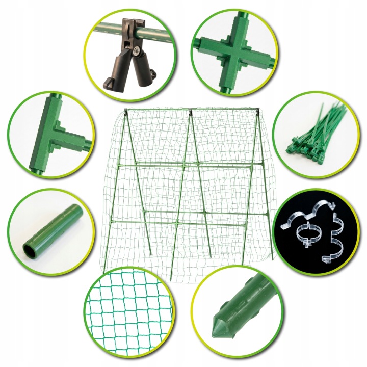 Opora za rastline z mrežo, 1,8 x 2,7 m | Garden Line podpira rast vzpenjavk in rastlin z mehkimi stebli (paradižnik, kumare, grozdje). Zaradi svoje konstrukcije je zelo odporna, tudi na vremenske razmere. Namen uporabe konstrukcije je predvsem podpora rasti rastlin, zahvaljujoč mreži za vzpenjavke, ki je del kompleta, pa prispeva tudi k njihovemu pravilnemu razvoju.