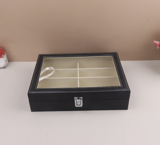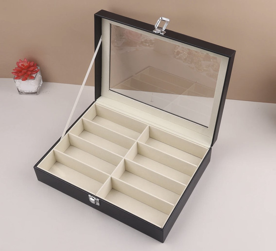 Organizator za očala, 8 predalov, črn | Soulima je praktična škatla za shranjevanje, ki bo zaščitila vaša očala pred praskami in poškodbami. Etui je na zunanji strani izdelan iz umetnega usnja, na notranji strani pa ima flanelasto podlogo, ima pa tudi zaponko, ki preprečuje nenamerno odpiranje. Stojalo za očala je bolj dekorativna možnost, ki vam omogoča, da razstavite svojo zbirko očal in imate enostaven dostop do njih.
