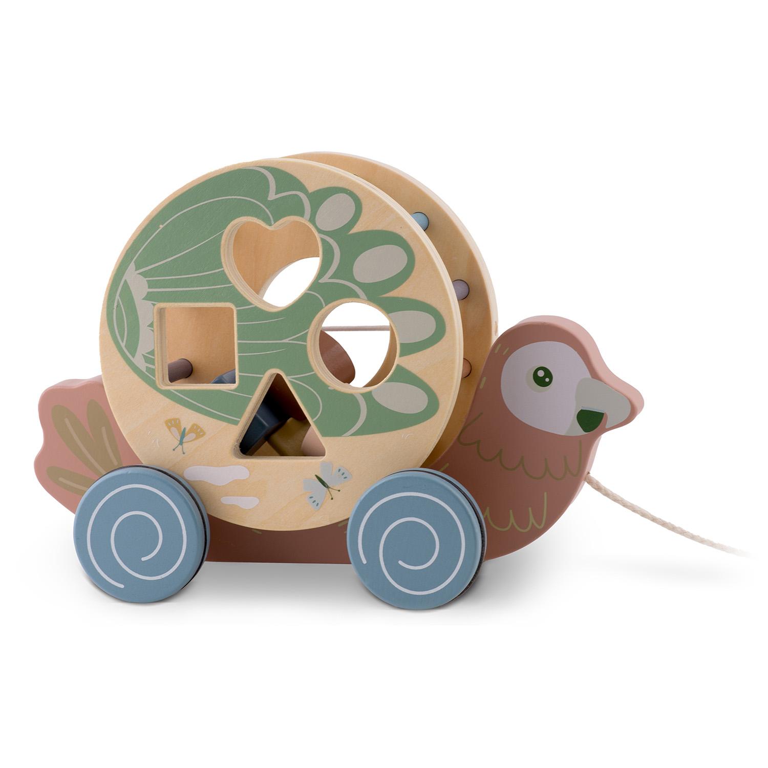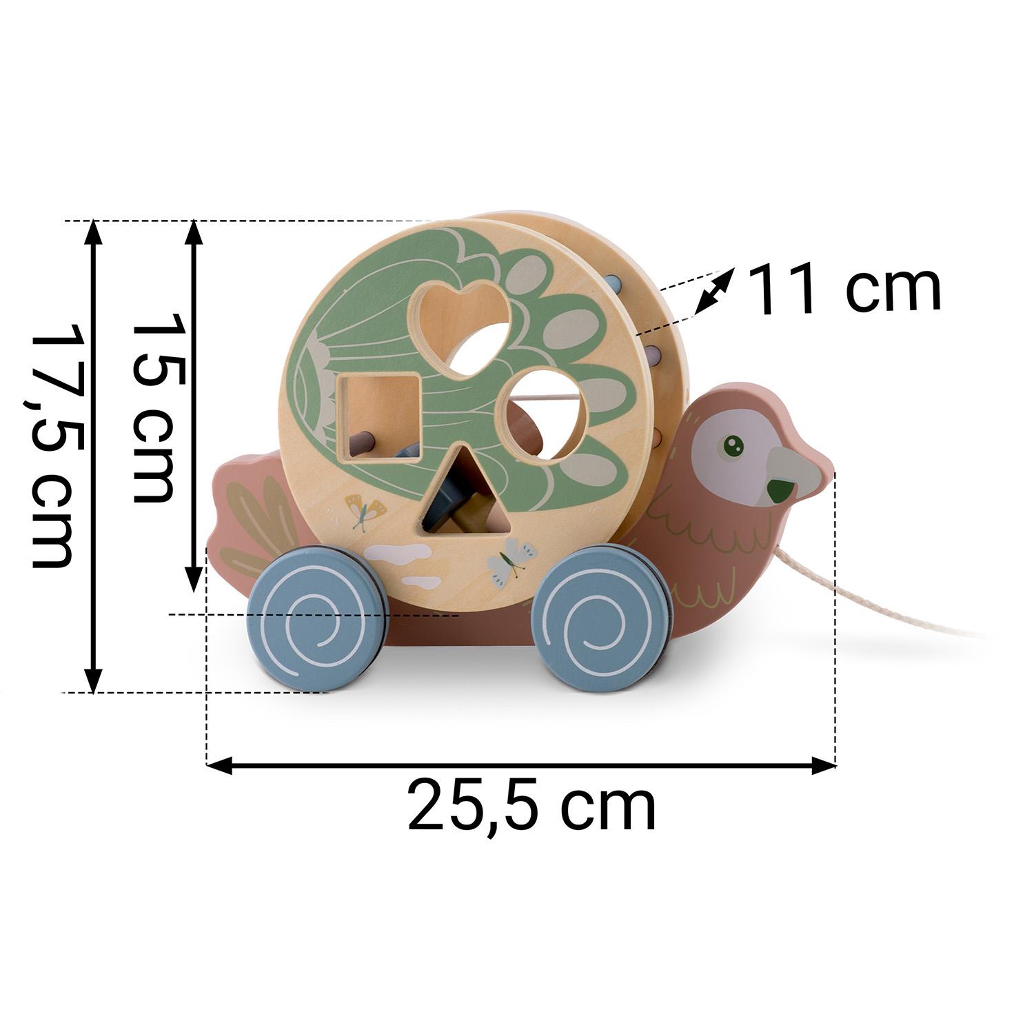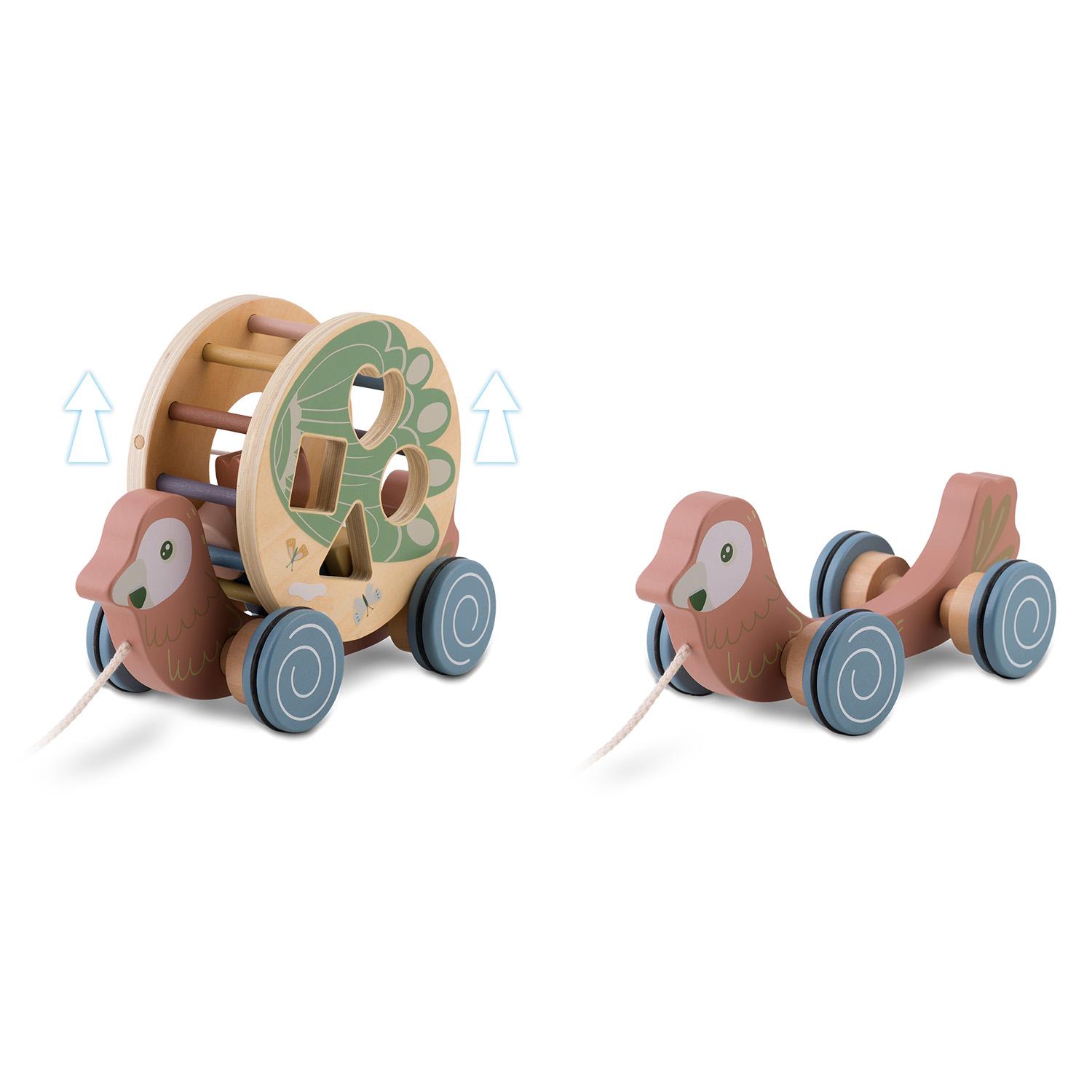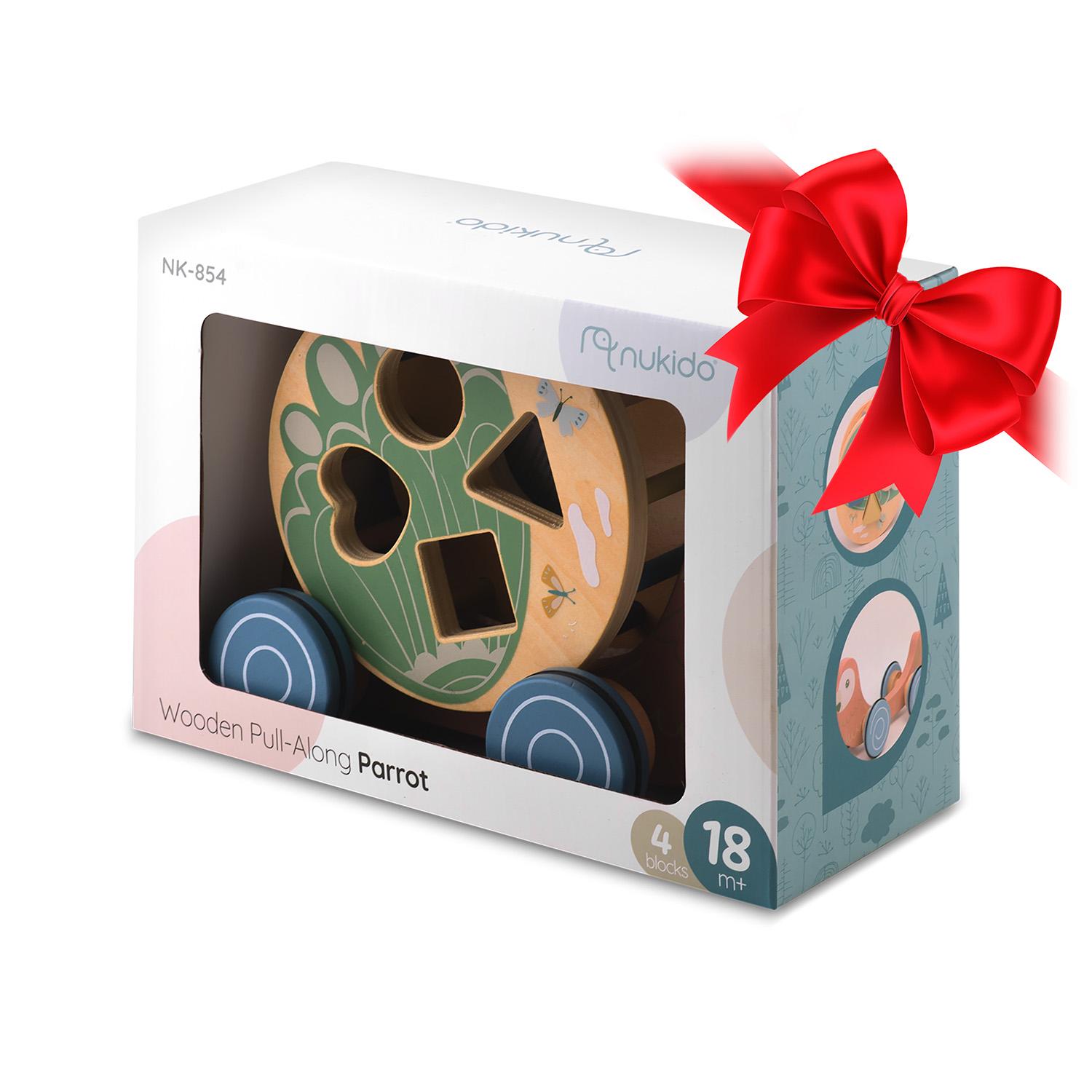 Otroška lesena igrača NK-854, papiga | Nukido je idealna za najmlajše, saj na igriv način podpira razvoj ravnotežja, koordinacije in otrokovih prvih korakov. Ta izobraževalni leseni model papige na kolesih pomaga otrokom slediti gibanju z vlečenjem vrvice in postopoma graditi prvo razumevanje vzroka in posledice – ko se igrača premika naprej, se kolesa obrnejo in mehanizem v notranjosti premakne barvni razvrščevalec na hrbtu papige.