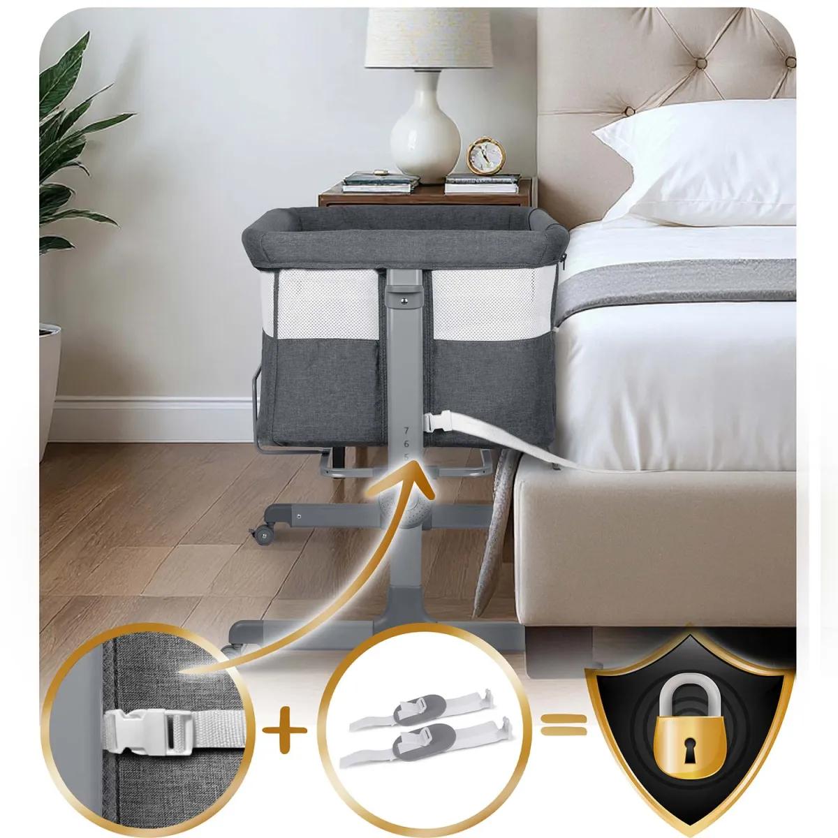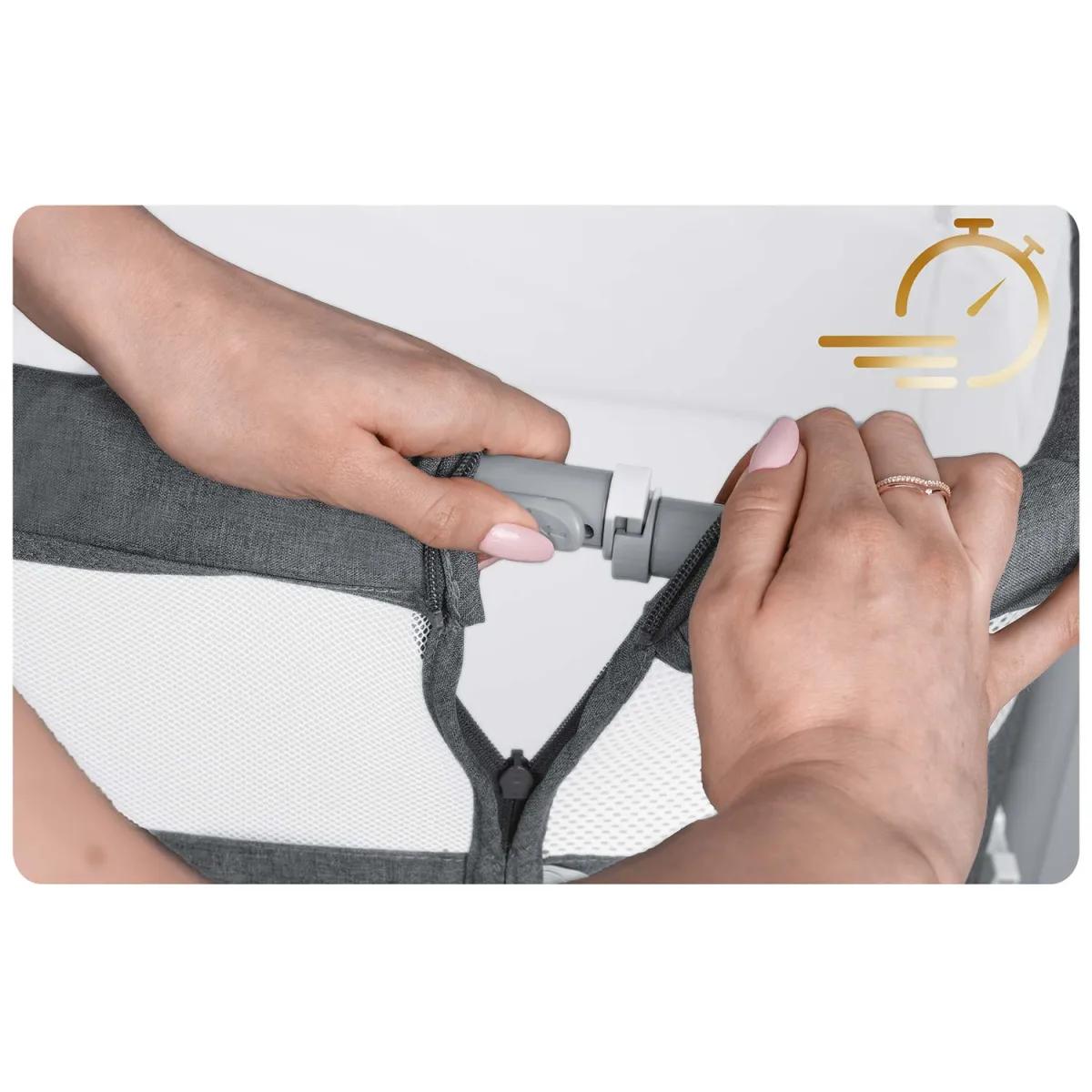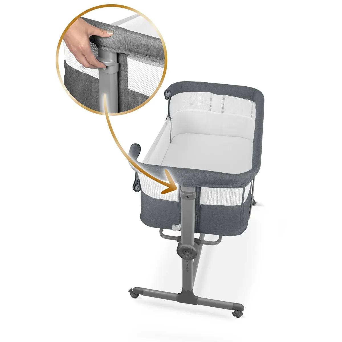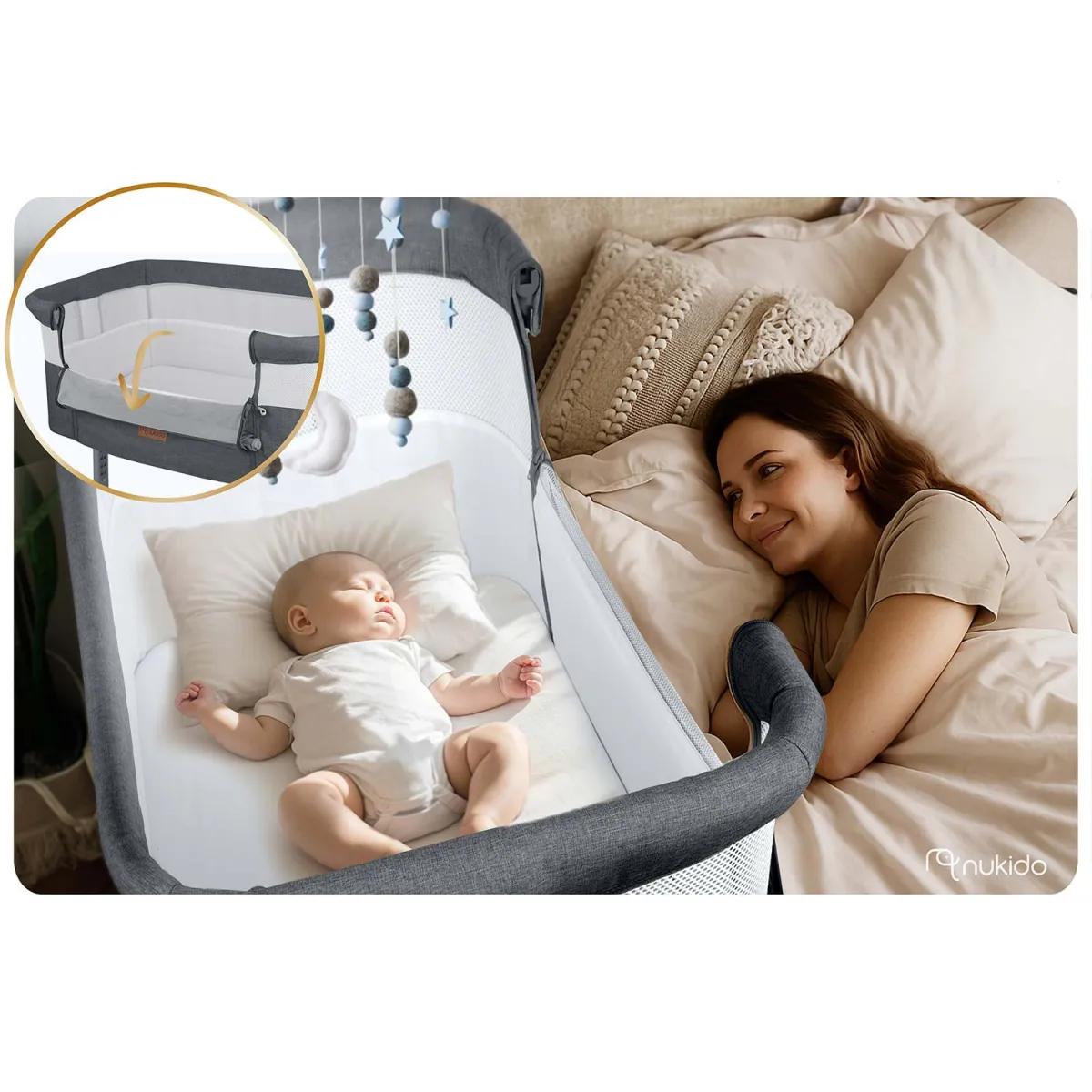Otroška potovalna posteljica NK-243, zložljiva, temno siva | Nukido z izvlečnim delom ponuja praktično rešitev za starše in dojenčke na poti. Izdelana je tako, da je lahka in zložljiva, kar omogoča enostavno rokovanje in prenašanje med potovanjem. Višino je mogoče nastaviti v 7 stopnjah, neodvisno z vsake strani, kar pomaga prilagoditi posteljico višini vaše vzmetnice.