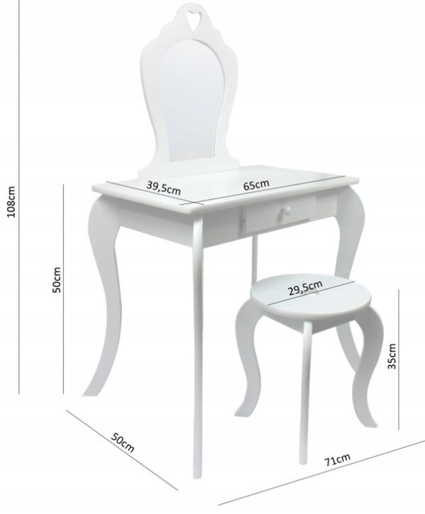 Izdelane so iz masivne MDF plošče, ki zagotavlja stabilnost in vzdržljivost, medtem ko dizajn poudarja vintage elemente – okrasne noge, nežne ključavnice predalov in pastelni odtenek, ki skupaj izgledajo zelo dekorativno. En prostoren predal ponuja dovolj prostora za shranjevanje kozmetike in dodatkov, stolček pa zagotavlja udobno sedenje med oblačenjem.