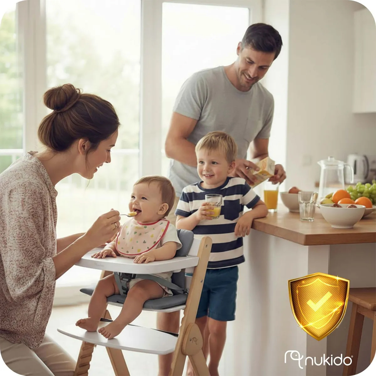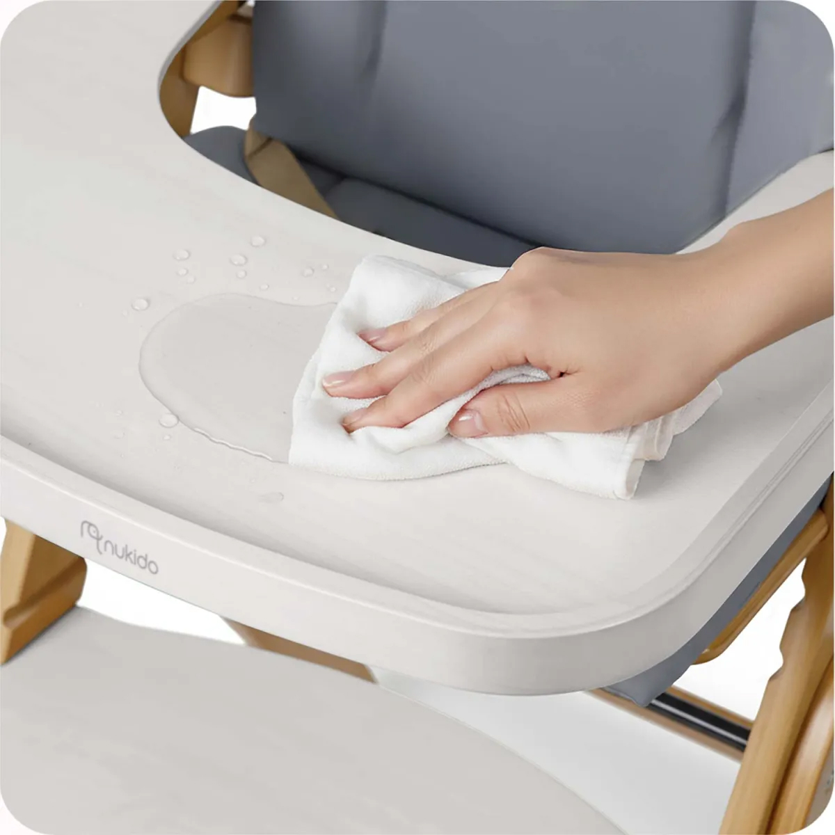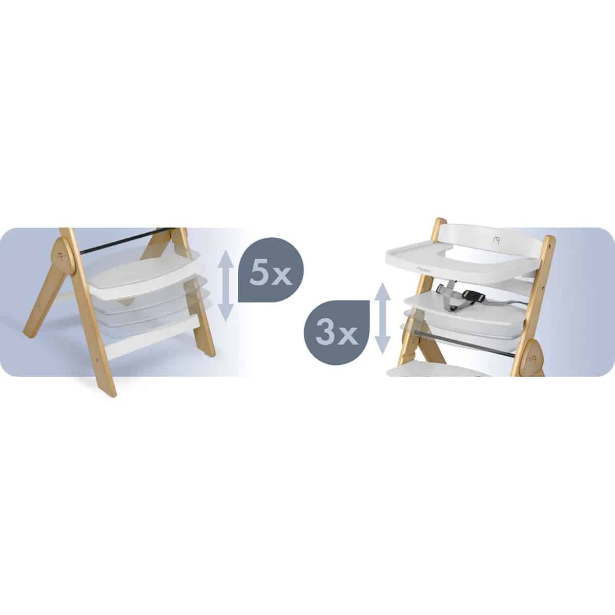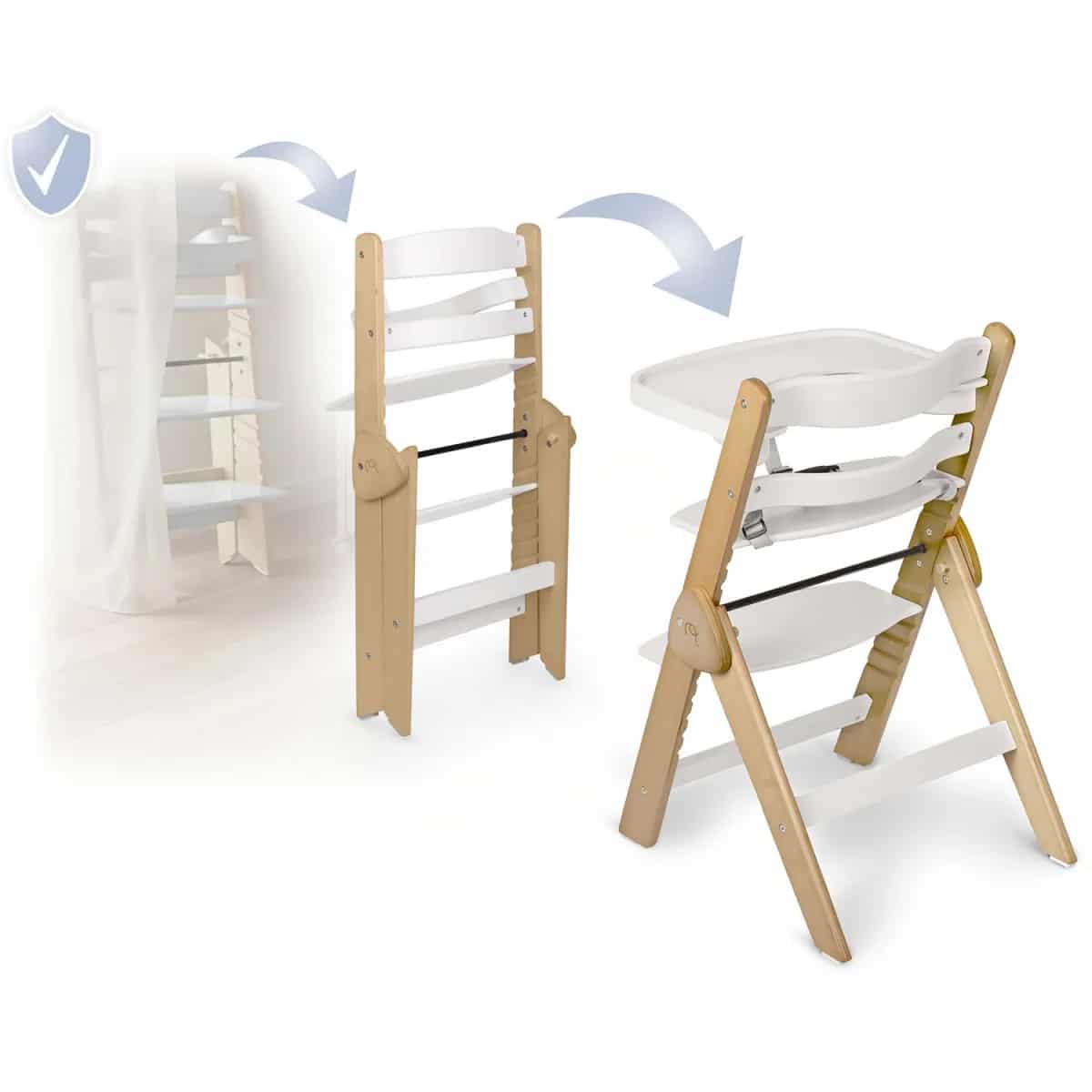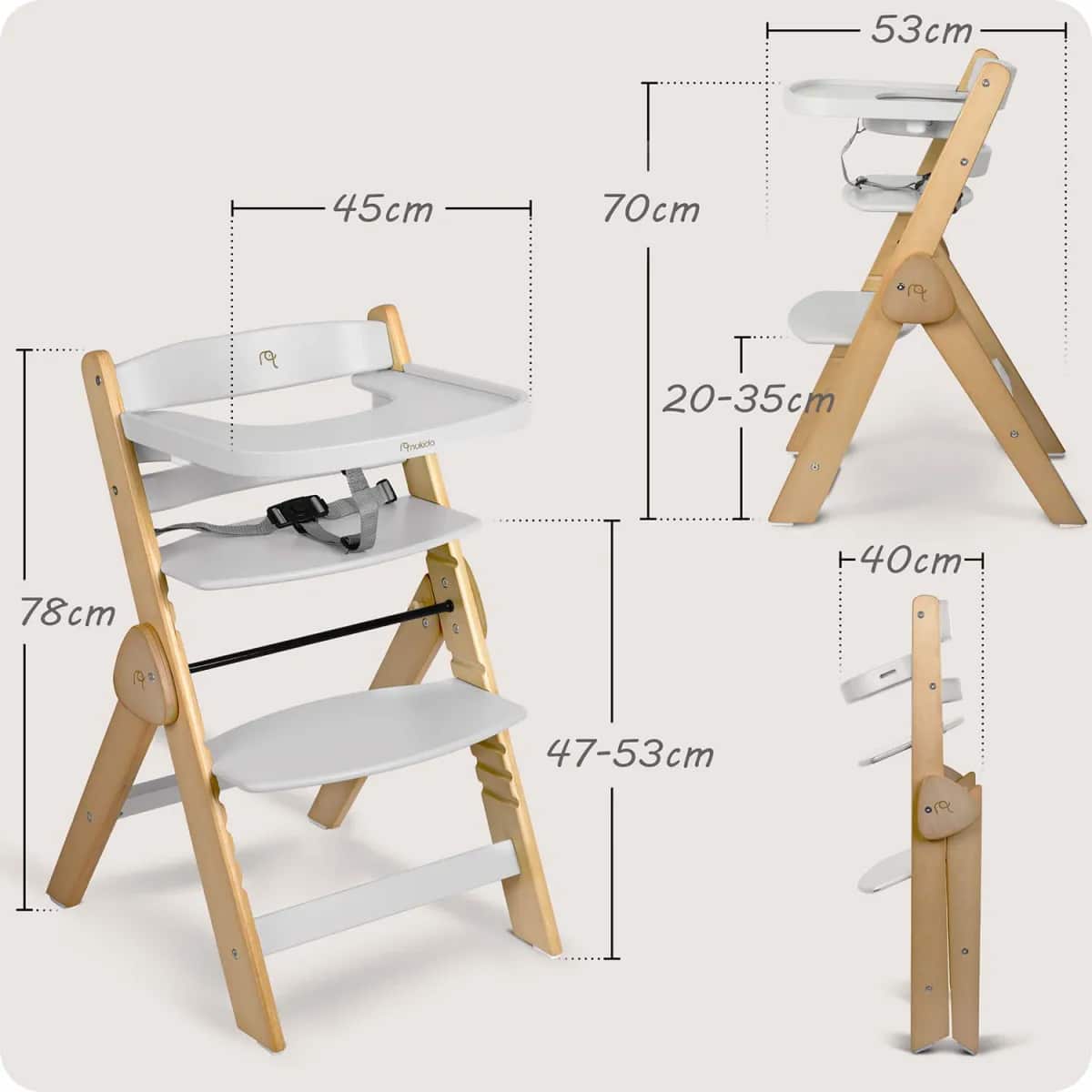 Stolček je izdelan iz visokokakovostnega lesa z gladko površino in zaobljenimi robovi, kar poveča njegovo vzdržljivost in varnost pri vsakodnevni uporabi. Preprosta zasnova se zlahka integrira v različne notranje sloge in hkrati omogoča enostavno vzdrževanje. Praktična konstrukcija zagotavlja, da se otrok lahko enostavno usede in vstane, kar boste cenili med vsakodnevnim hranjenjem in med družinskimi obroki za mizo.