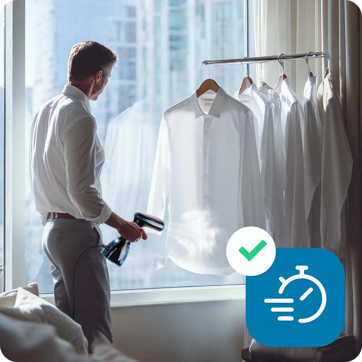 Zahvaljujoč nežnemu likanju s paro je primeren tudi za občutljive materiale, kot so svila, bluze ali zavese. Rezervoar za vodo s prostornino 280 ml omogoča več minut neprekinjenega delovanja in ga je mogoče enostavno odklopiti in ponovno napolniti. Upravljanje je zelo preprosto – samo en gumb, dopolnjen z indikatorsko lučko delovanja.