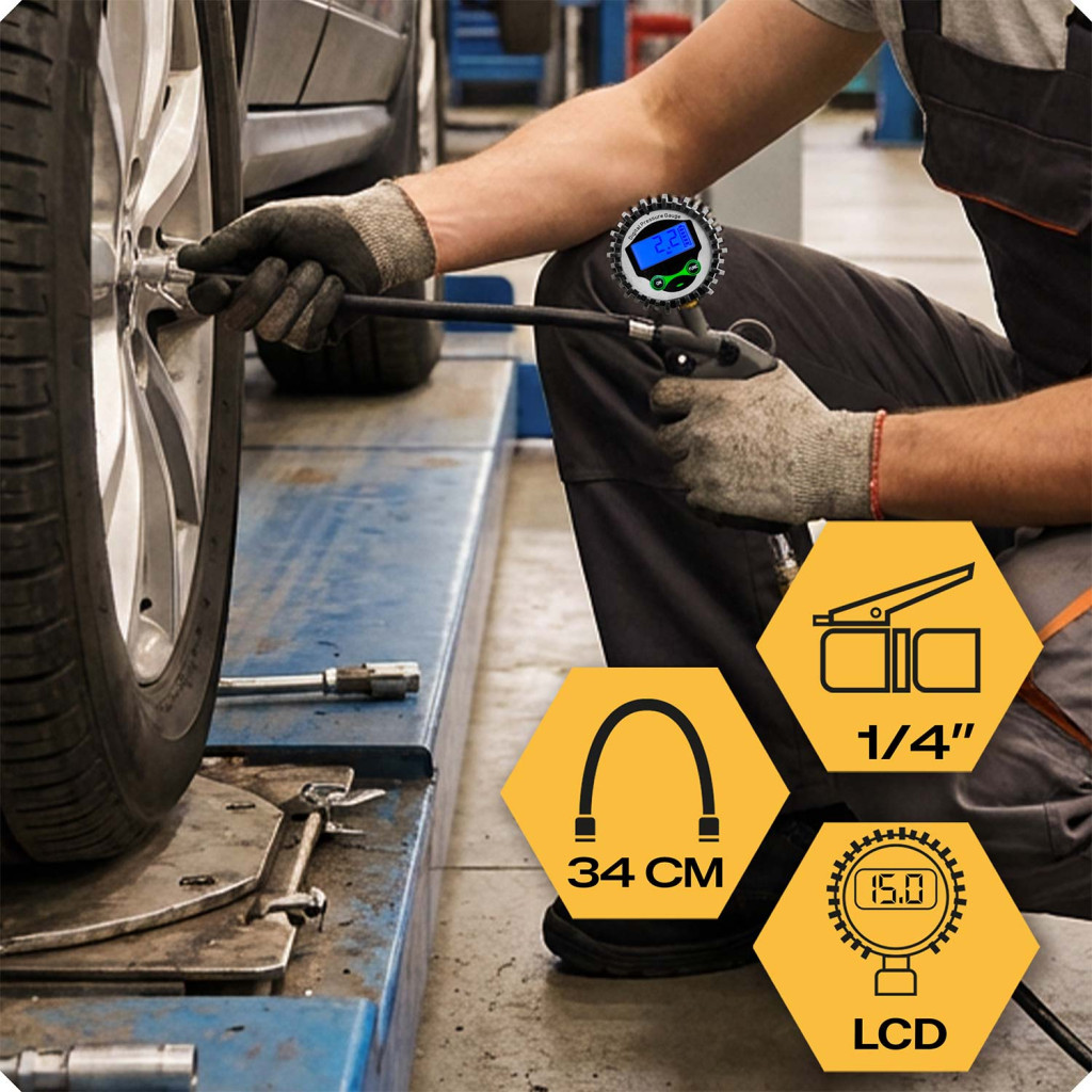 Elastični nastavek za cev dolžine približno 34 cm izboljša rokovanje in omogoča priročno priključitev tudi na težko dostopnih mestih. Standardni 1/4″ priključek zagotavlja združljivost z večino kompresorjev, kar povečuje vsestranskost uporabe. Neprekinjena regulacija tlaka omogoča natančno polnjenje pnevmatik na avtomobilih, motornih kolesih in kolesih, orodje pa pomaga preprečevati premajhno ali prekomerno polnjenje.