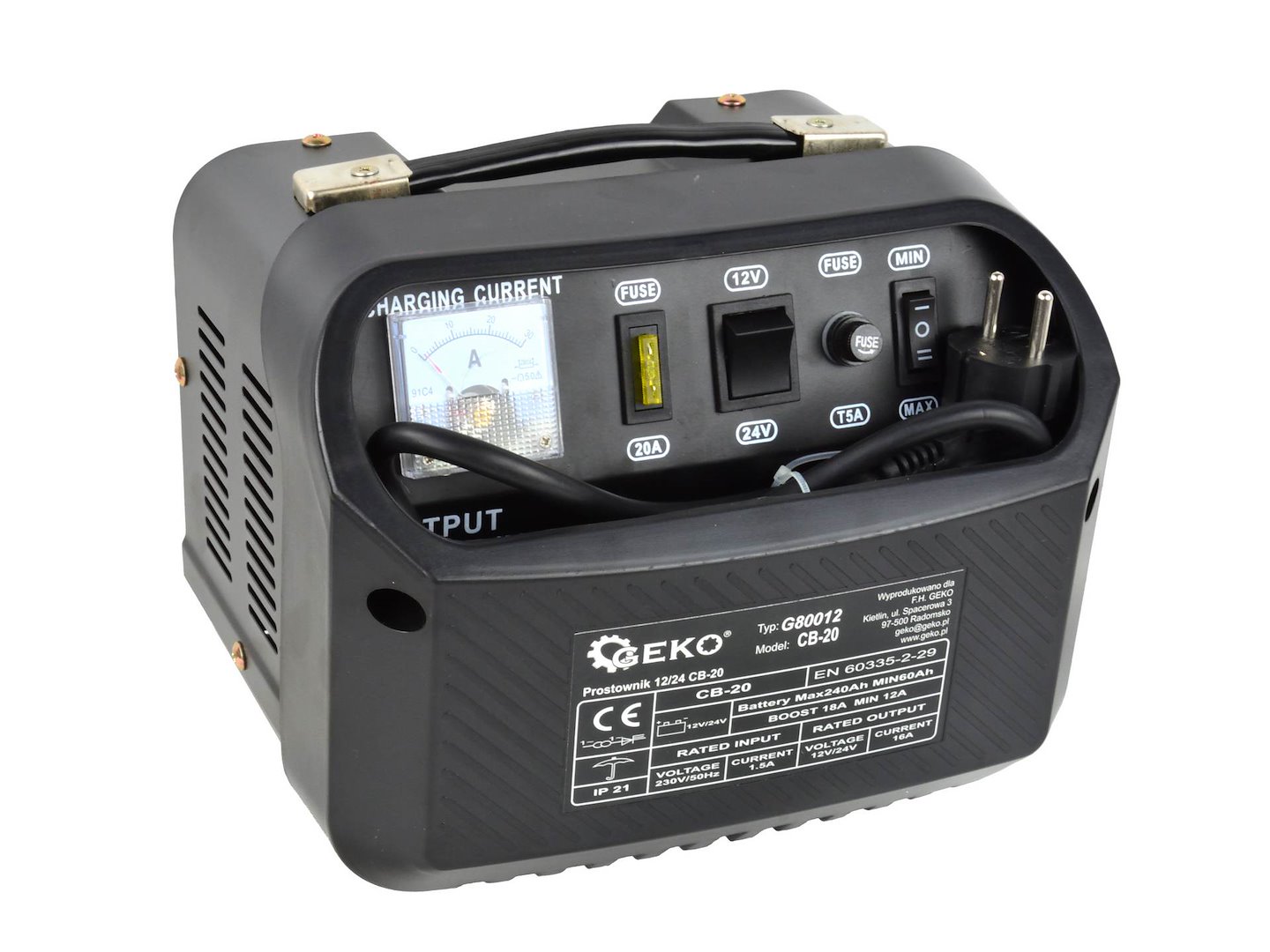 Polnilnik avtomobilskih akumulatorjev, 12/24V, CB-20 | GEKO zagotavlja zanesljivo zagonsko moč v avtomobilih in gospodarskih vozilih. Namenjen je polnjenju svinčeno-kislinskih (STD) akumulatorjev z napetostjo 12 V ali 24 V, ki se uporabljajo v osebnih avtomobilih, kombijih, tovornjakih itd. Ima vgrajeno varovalko, ki ščiti napravo pred napačno polariteto in kratkimi stiki.