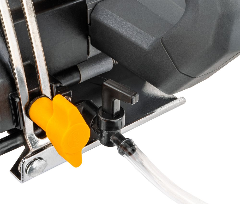 Rezalnik ponuja polno funkcionalnost tako v mokrem kot suhem načinu rezanja, kar vam omogoča, da izberete idealen način dela za vrsto materiala. Sistem vodnega hlajenja zmanjšuje tveganje pregrevanja rezila, omejuje prah in izboljšuje delovne pogoje, kar zagotavlja gladke in čiste reze tudi pri dolgotrajni uporabi. Rezalna glava in zaščitni pokrov sta izdelana iz debelega litega železa, masivna jeklena osnovna plošča pa zagotavlja visoko odpornost na poškodbe in deformacije.