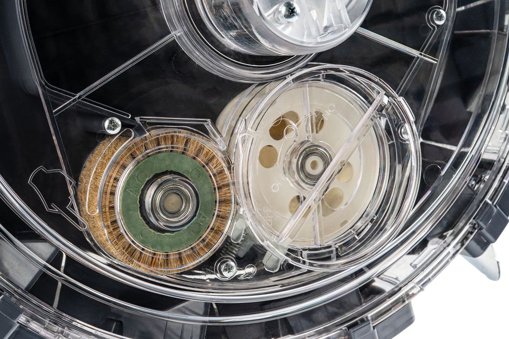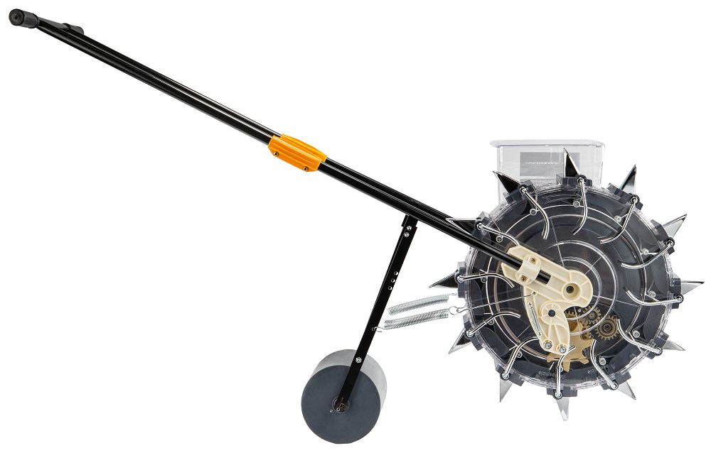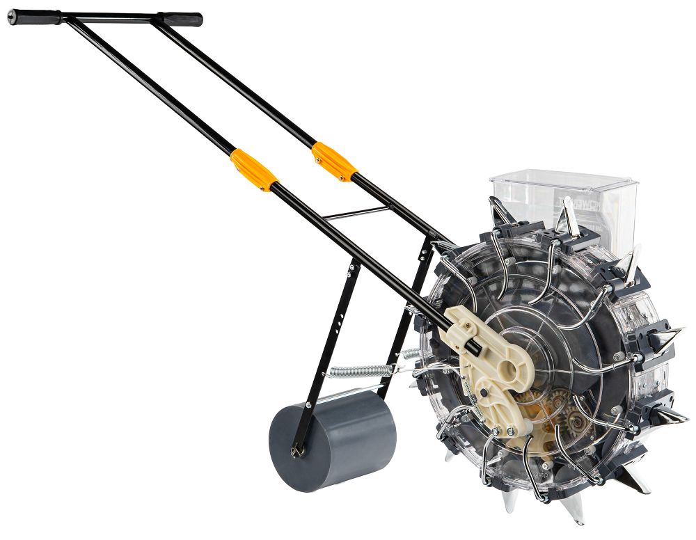 Zasnova zagotavlja stabilno vodenje stroja po tleh, kar se odraža v enakomerni setvi. Pritisni valj je odgovoren za zbijanje tal po setvi, zaradi česar imajo semena boljši stik s podlago in enakomerne pogoje za kalitev. Prostornina 3,7 kg omogoča daljše delo brez pogostega dolivanja semen, kar resnično pospeši celoten postopek setve. Prozoren rezervoar vam omogoča popoln nadzor nad nivojem, tako da dela ne prekinjate v nepričakovanem trenutku.