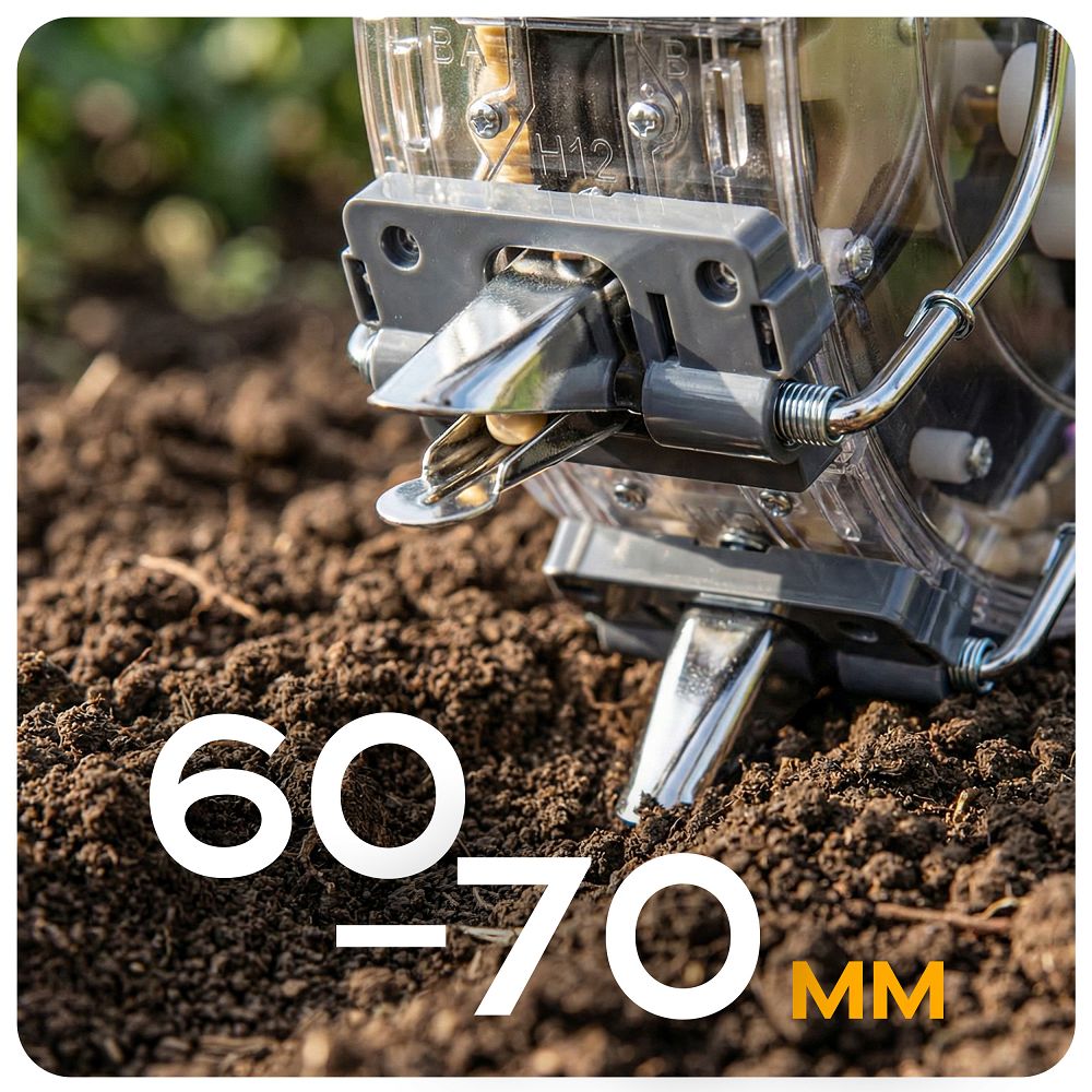 Prilagodite globino in razmik, tako da lahko setev prilagodite koruzi, fižolu, grahu ali soji. Dobite univerzalno orodje za različne poljščine, ne da bi morali menjati napravo. Sejalnica poseje 1-2 semeni na enak razmik, zaradi česar imajo rastline optimalne pogoje za rast. Dosegli boste manjšo izgubo materiala in bolj predvidljive rezultate, ne da bi morali popravljati vrste. Možnost nastavitve globine 60–70 mm omogoča prilagoditev setve vrsti tal in semenu.