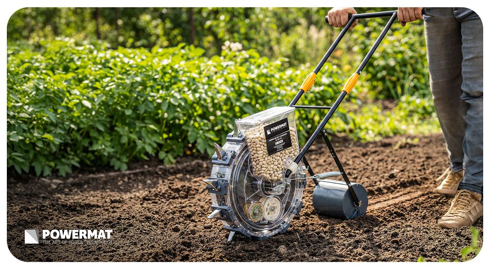 Ročna sejalnica za točkovno setev, 3,7 kg | PM-SRO-25T omogoča natančno in enakomerno setev semen brez potrebe po sklanjanju, kar olajša delo na vrtu. Naprava uporablja krtačo za večja semena in sistem žlice za manjša, kar vam omogoča, da prilagodite način setve vrsti materiala. Zahvaljujoč temu se semena zbirajo in odlagajo nadzorovano in enakomerno. Zmanjšate tveganje za poškodbe in napake med setvijo. Pridobite večjo vsestranskost, ne da bi morali menjati napravo.