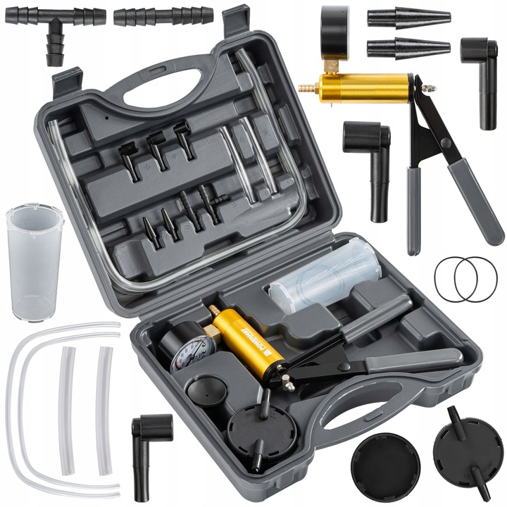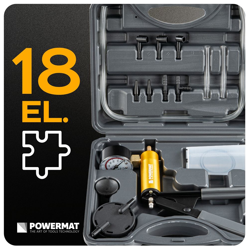 Ročna vakuumska črpalka, 18-delni komplet | PM-PPC-120T vam omogoča hitro in natančno preverjanje vakuumskih sistemov v bencinskih ali dizelskih motorjih. Diagnosticirate lahko zavore, EGR ali cevi brez dodatnega orodja, s čimer prihranite čas in se izognete dragim in nepotrebnim zamenjavam. Praktični prenosni kovček vsebuje kable, konektorje, vtiče in posodo. Odprite ga in se lotite dela – prihranite si čas in denar za dodatno opremo.