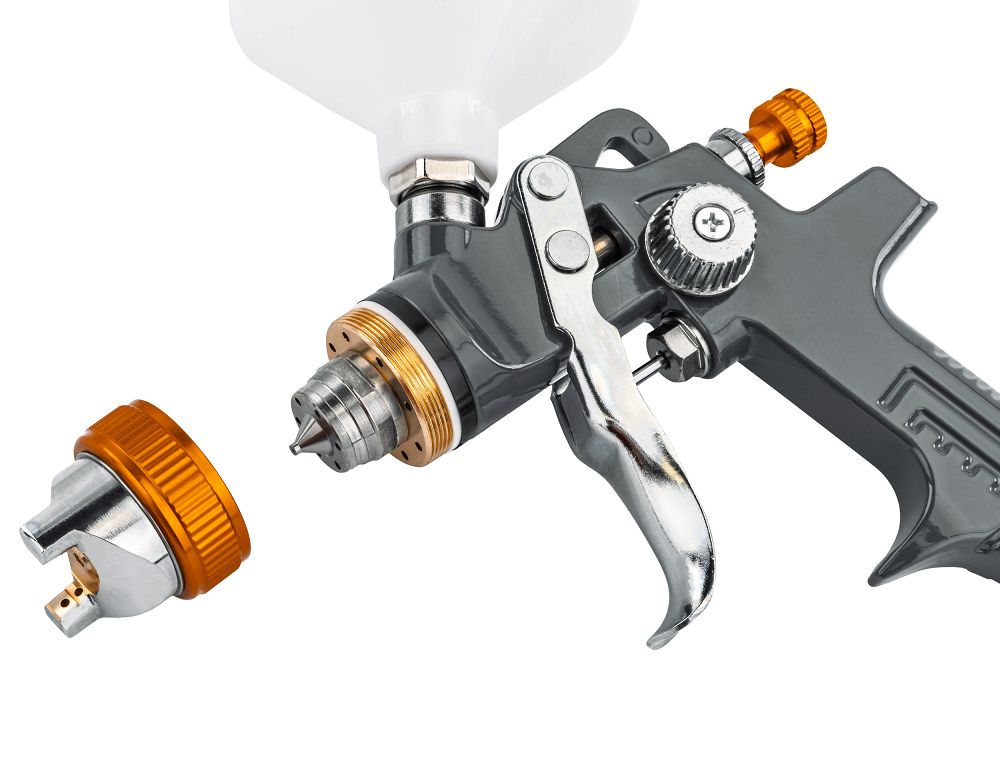 Poleg tega naprava omogoča natančen nadzor oblike curka – okrogel, širok ali ploščat, kar se prilagaja različnim slikarskim nalogam. Zgornji rezervoar s prostornino 600 ml zagotavlja stalno oskrbo z materialom zaradi gravitacijskega dovajanja. Vgrajen filter zajame umazanijo in grudice, s čimer ščiti šobo pred zamašitvijo in izboljšuje kakovost površine.