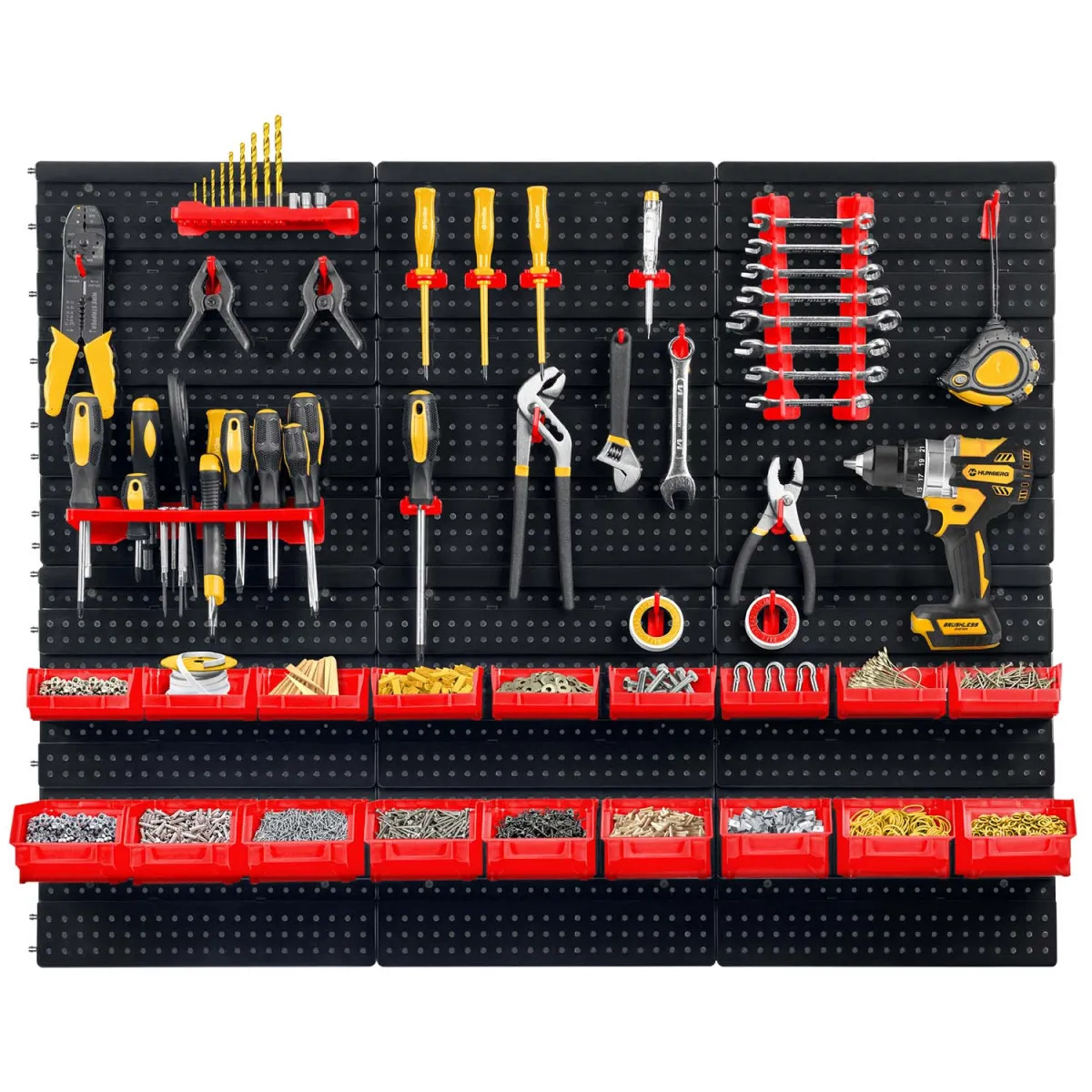 Stena za orodje v delavnici HM-581, 96x76cm | Humberg je praktična organizacijska plošča, ki vam bo pomagala ohranjati urejenost vaše delavnice. Komplet vsebuje do 43 dodatkov (kivete, kavlji, police, držala), ki jih lahko uporabnik prosto postavi glede na svoje potrebe, kar omogoča popolno, prilagojeno zasnovo delovnega prostora.