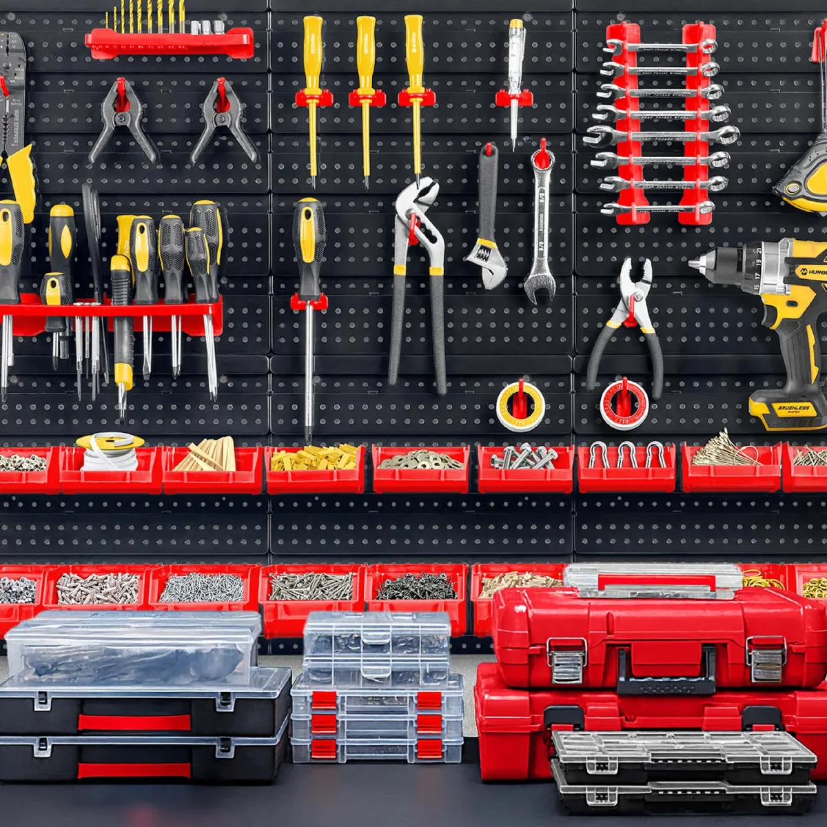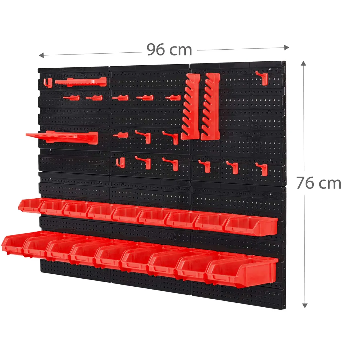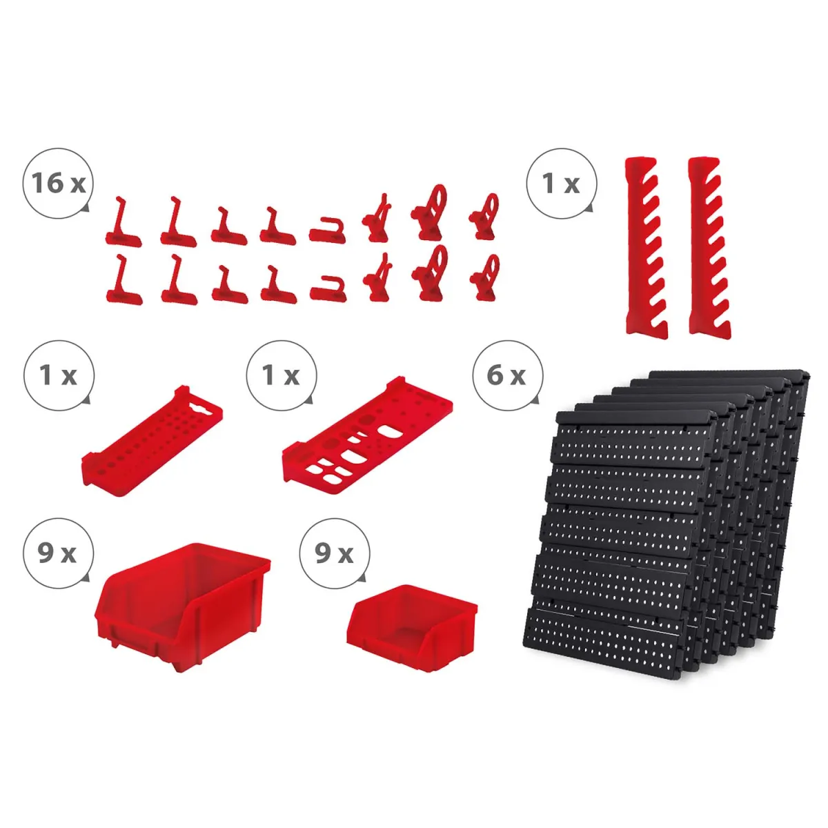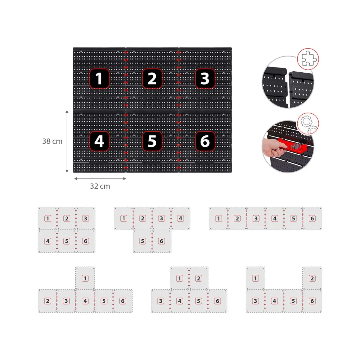 Plošča je sestavljena iz 6 modularnih delov, ki se povezujejo v eno samo površino. Proizvajalec je izbral materiale s poudarkom na vzdržljivosti – trpežne plastične komponente dopolnjujejo robustno podlago plošče. Zahvaljujoč temu izdelku lahko steno učinkovito uporabite za organizacijo vijakov, orodja, ključev in večjih delov, medtem ko ima vsak kos orodja svoje fiksno mesto in je vedno pri roki.