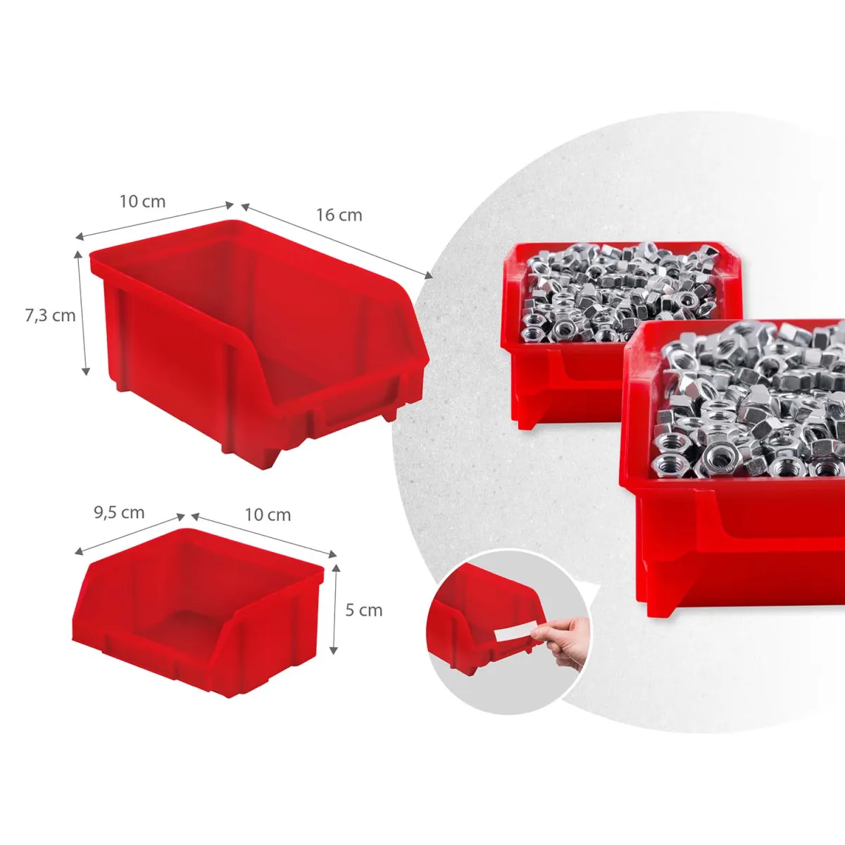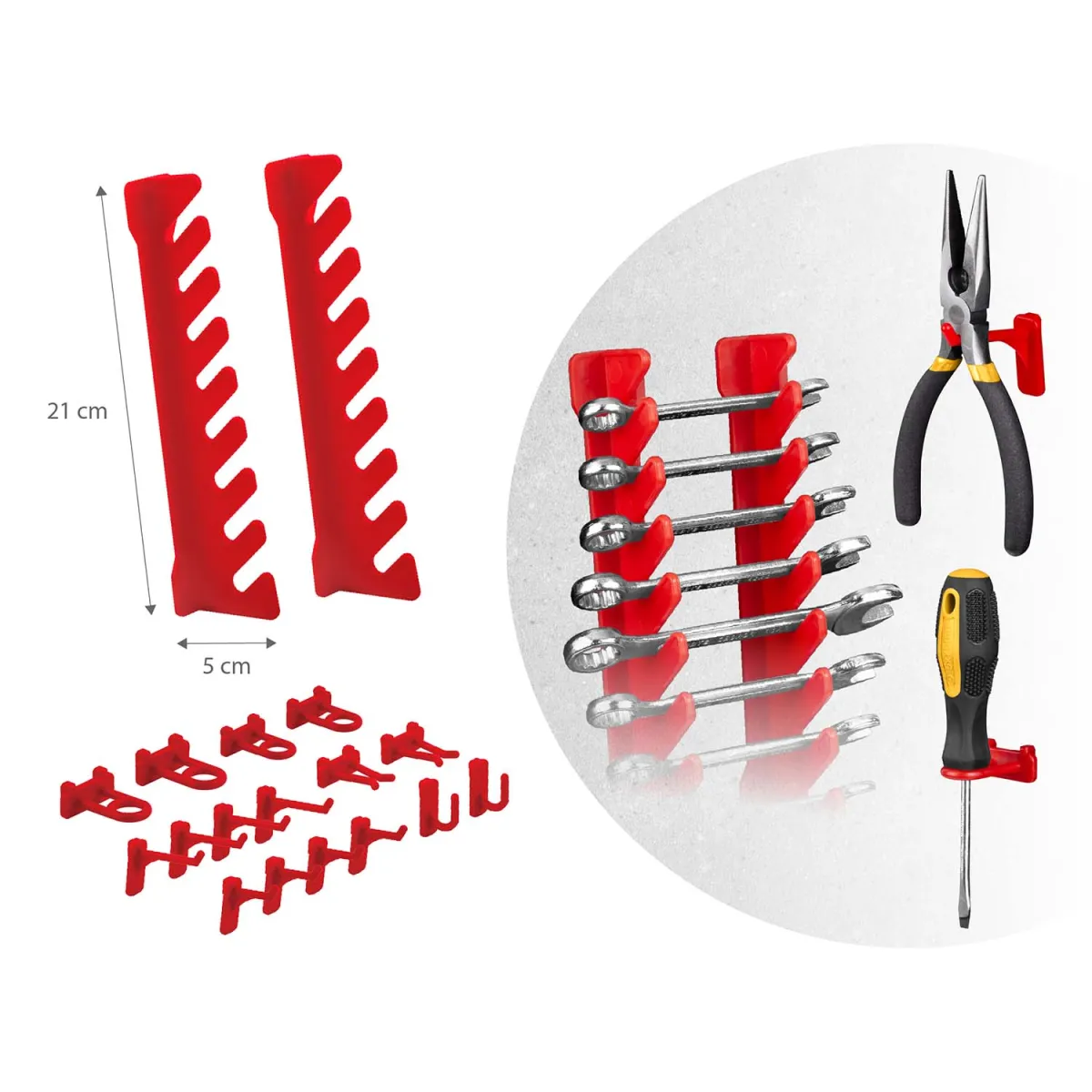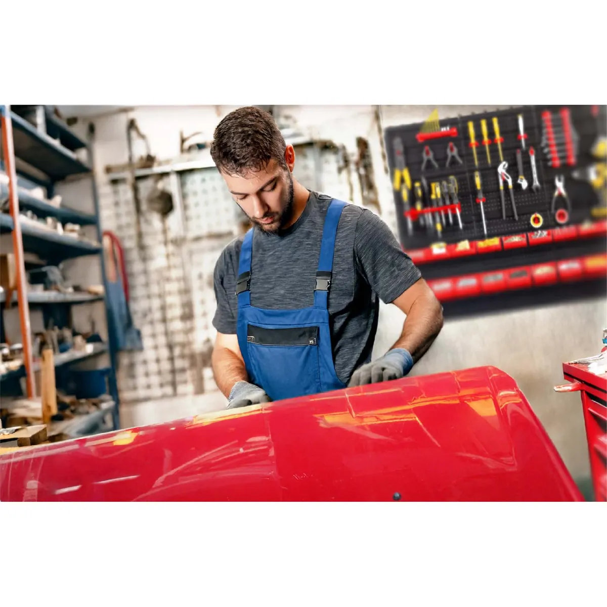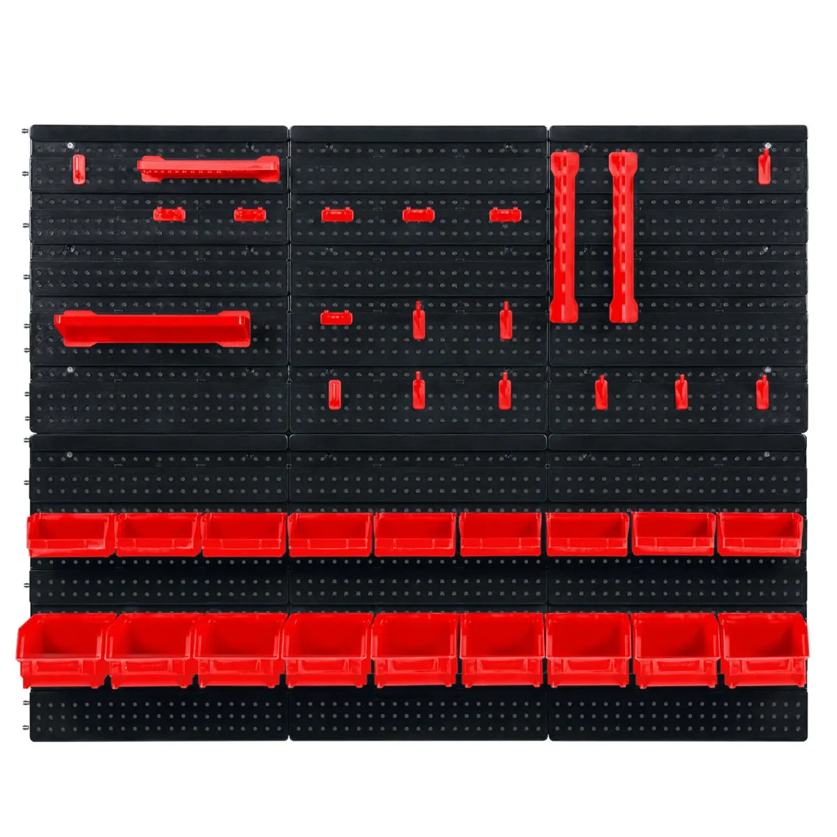 Plošča je sestavljena iz 6 modularnih delov, ki se povezujejo v eno samo površino. Proizvajalec je izbral materiale s poudarkom na vzdržljivosti – trpežne plastične komponente dopolnjujejo robustno podlago plošče. Zahvaljujoč temu izdelku lahko steno učinkovito uporabite za organizacijo vijakov, orodja, ključev in večjih delov, medtem ko ima vsak kos orodja svoje fiksno mesto in je vedno pri roki.